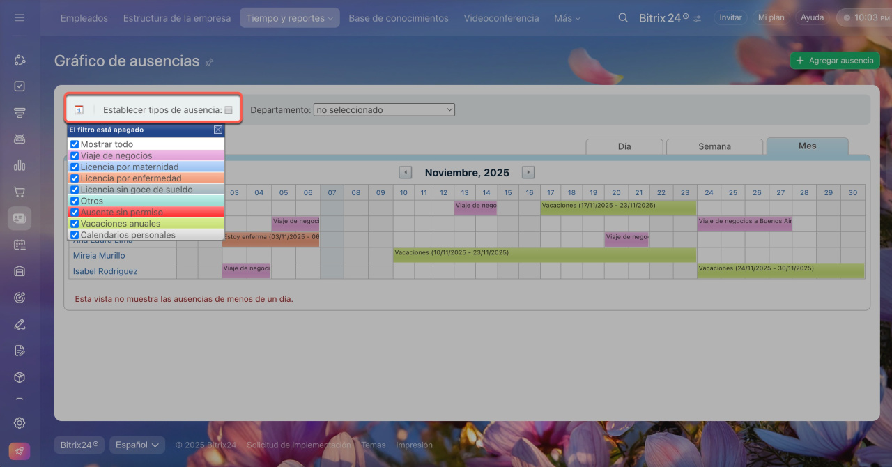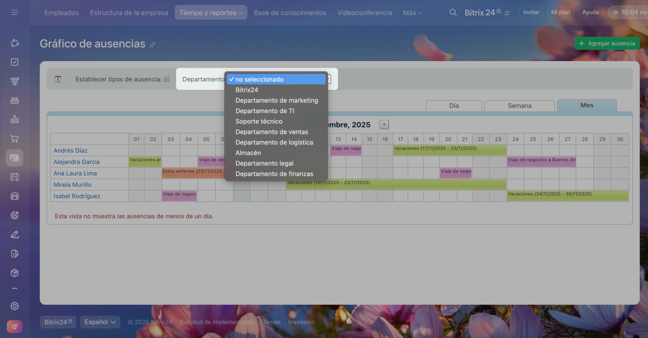 Filtrar por departamento. Por defecto, el gráfico muestra las ausencias de todos los empleados. Para ver solo los datos de un departamento específico, selecciónalo en la lista desplegable.