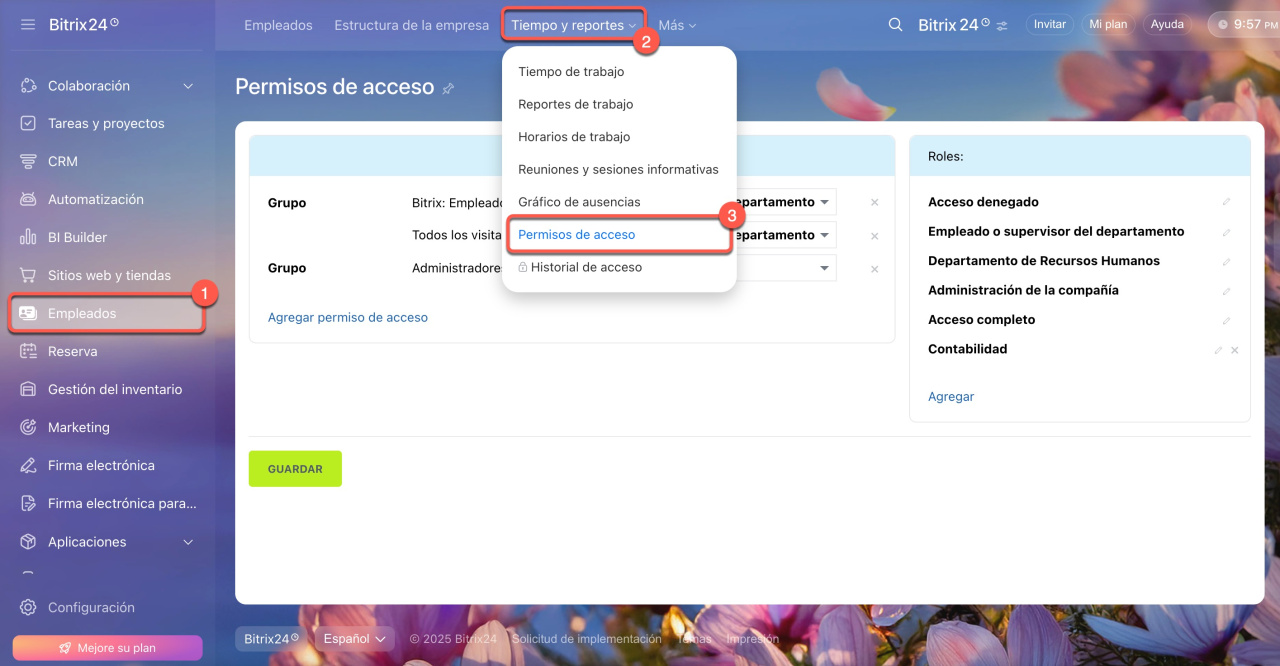 Accede a Empleados > Tiempo y reportes > Permisos de acceso.
