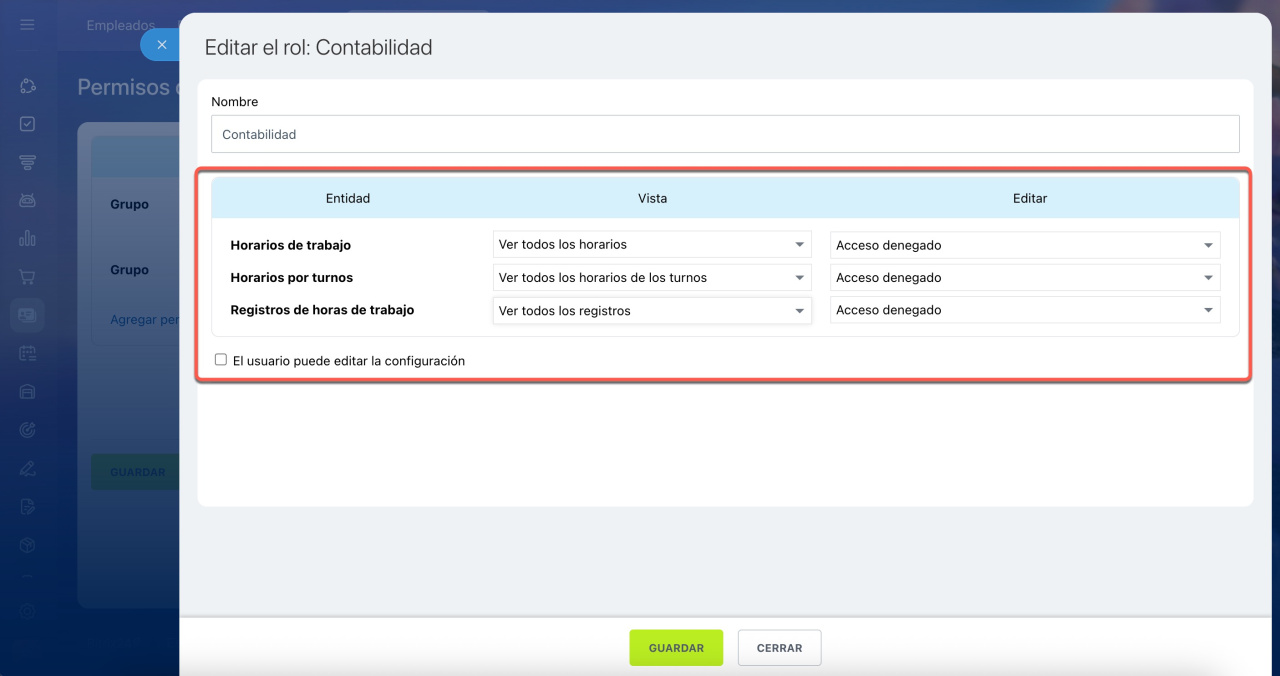 - Configura los permisos de acceso a horarios de trabajo y registros de tiempo de trabajo definiendo qué secciones pueden ver o editar los empleados.