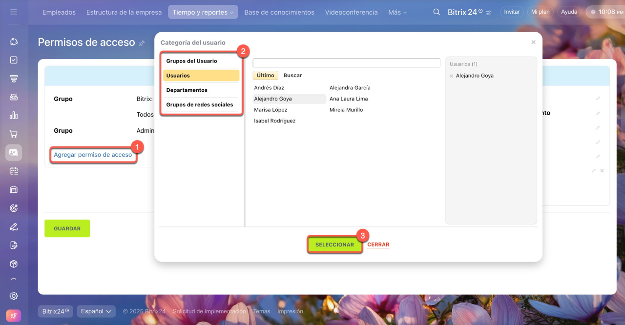 - Para configurar los permisos de acceso, selecciona o crea un rol, especifica el nivel de acceso y asigna el rol a los empleados correspondientes.