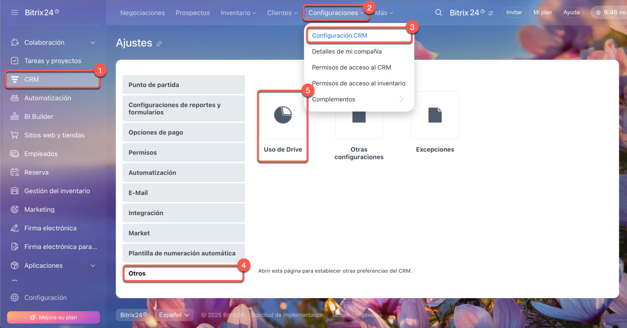 1-5. Ve a CRM > Configuraciones > Configuración CRM > Otros > Uso de Drive.