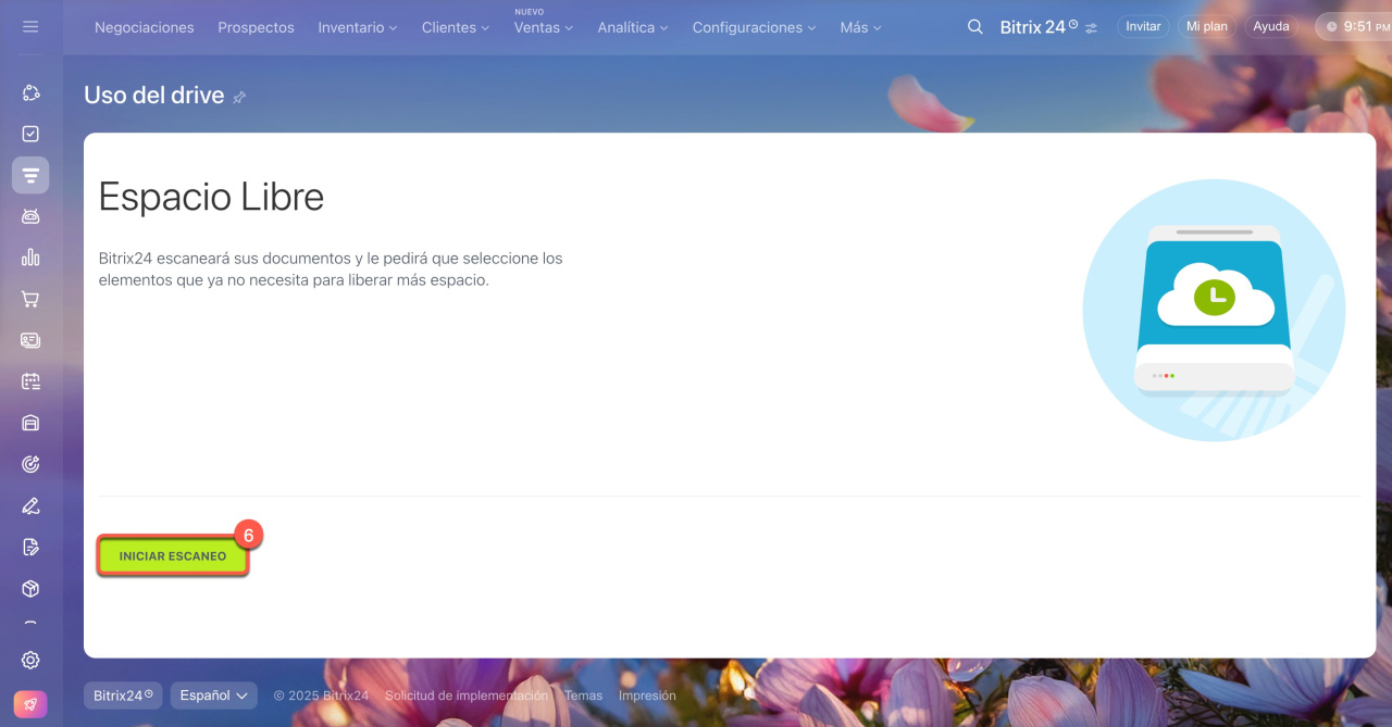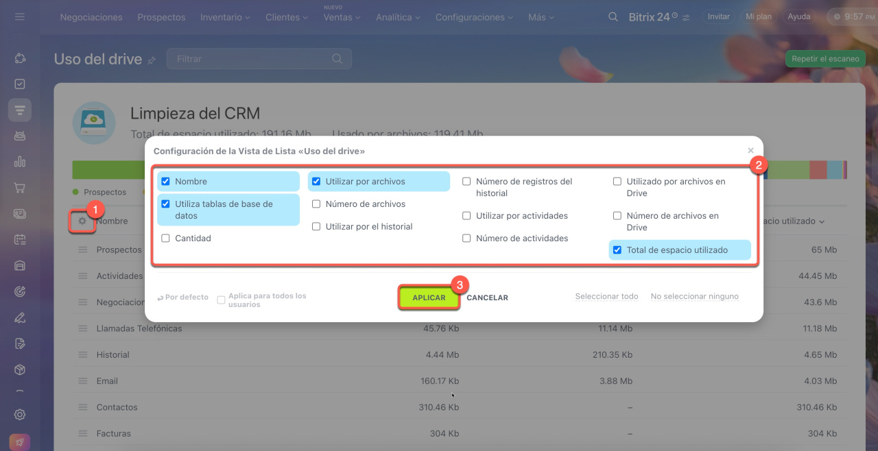 - Accede a CRM > Configuraciones > Configuración CRM > Otros > Uso de Drive > Iniciar escaneo. La tabla de resultados muestra qué datos ocupan más espacio, lo que te ayuda a priorizar la eliminación.