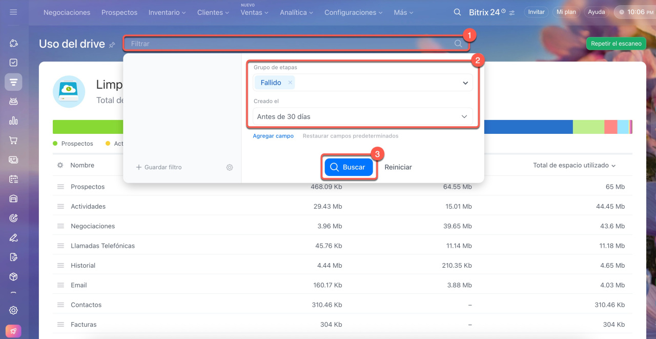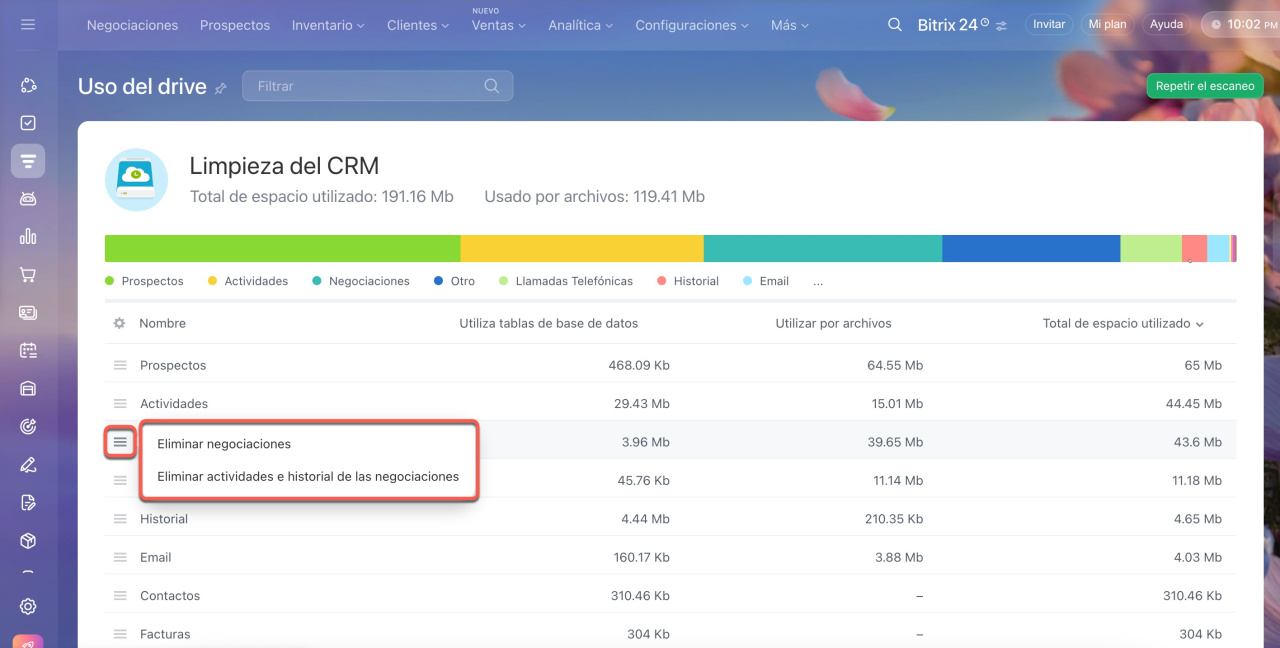 Cuando se agota el espacio en Bitrix24, no es posible crear nuevos prospectos, negociaciones, contactos u otros elementos. La herramienta Limpieza del CRM te ayuda a identificar rápidamente qué está ocupando espacio y a eliminar datos innecesarios, como negociaciones o prospectos antiguos.