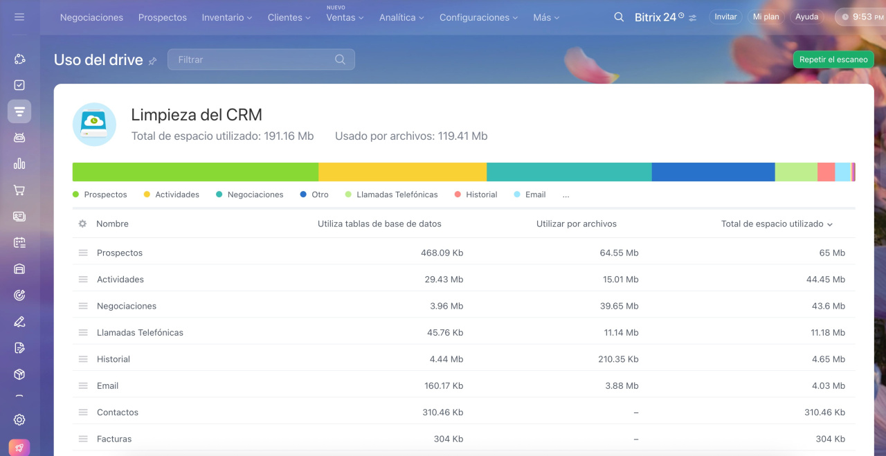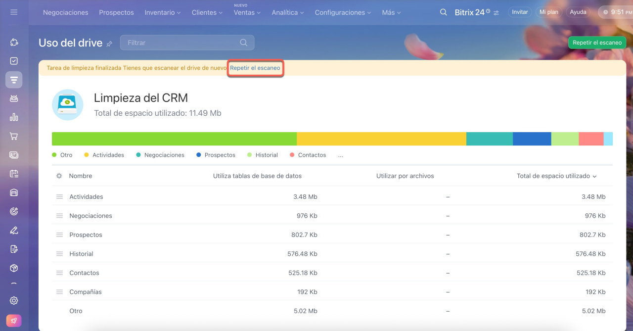 Una vez finalizado el escaneo, se mostrará una tabla con los resultados, que indica qué datos ocupan más espacio (por ejemplo, negociaciones con documentos o prospectos con actividades).