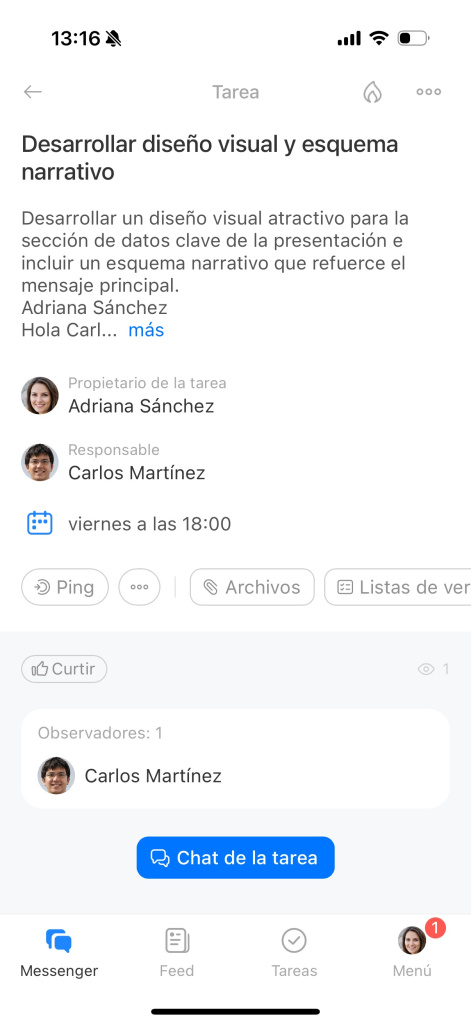 - Recibirás una notificación en el chat al crear la tarea. Luego, puedes personalizarla: añadir participantes, archivos y otros detalles.