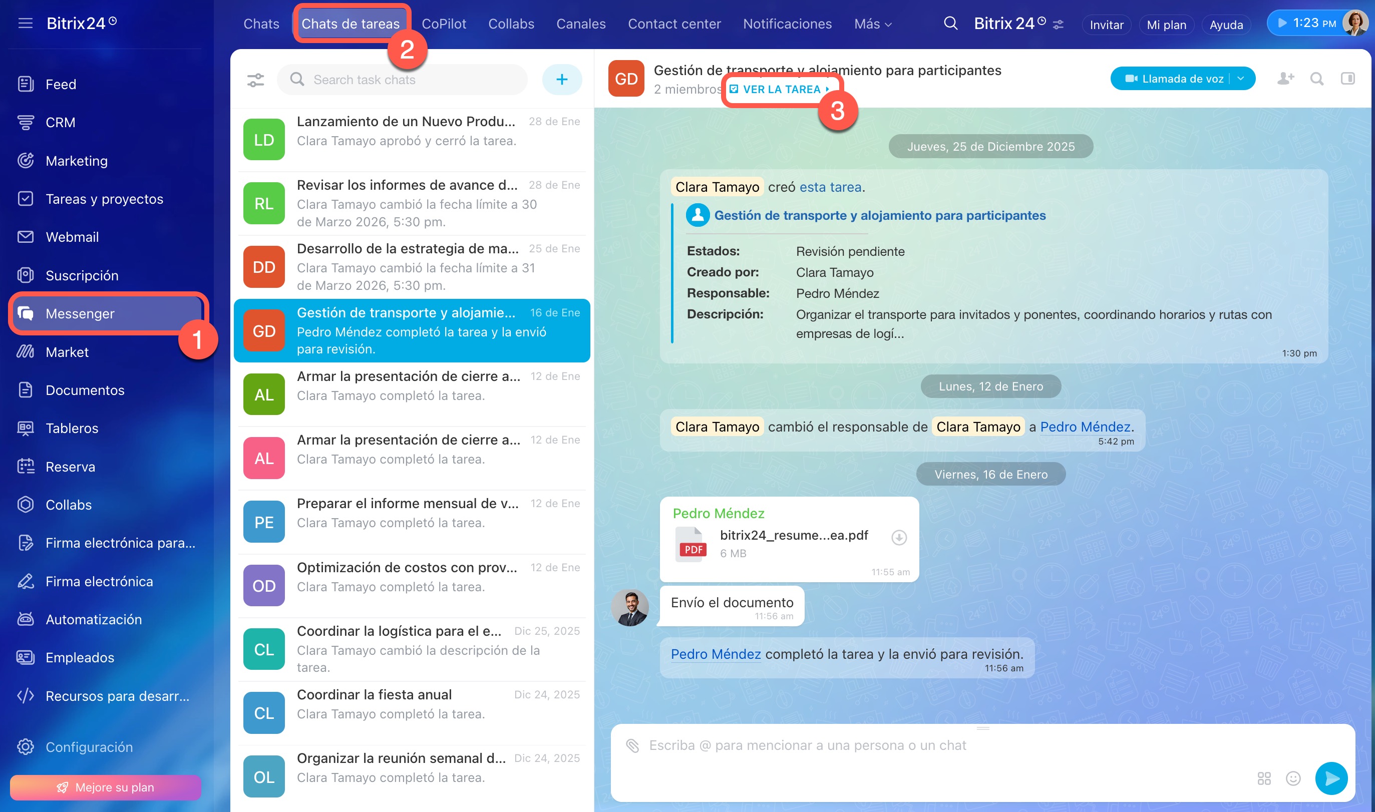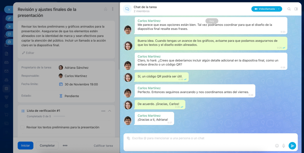 Ahora incluye un chat integrado. Aquí encontrarás todo el contexto de la conversación: puedes ver los últimos cambios, realizar llamadas, aclarar detalles y tomar decisiones rápidamente sin salir de la tarea.