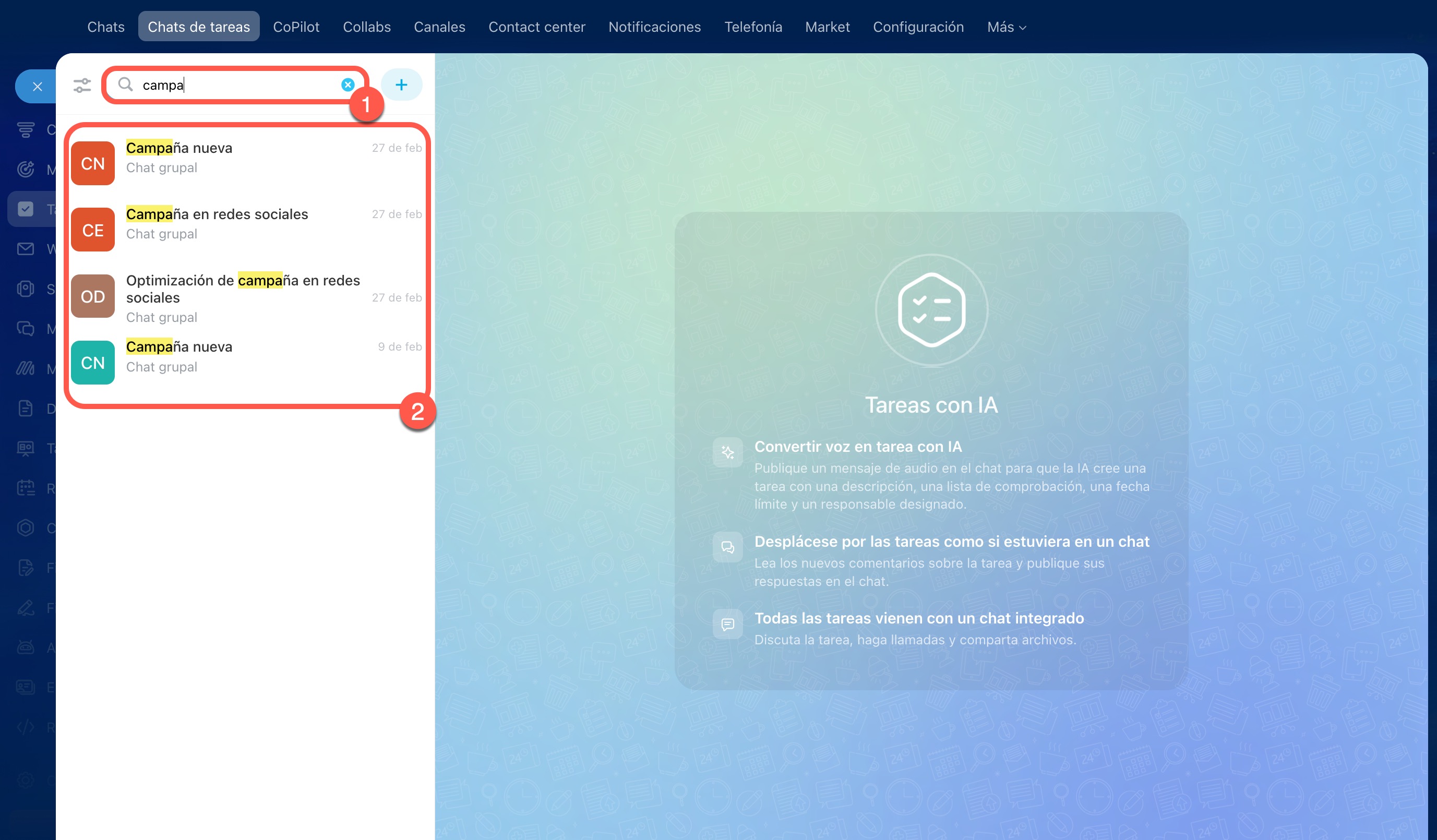 1. Haz clic en la barra de búsqueda situada encima de la lista de chats y comienza a escribir el nombre de la tarea. A medida que introduzcas el texto, se mostrarán en la lista los resultados que coincidan con tu búsqueda.