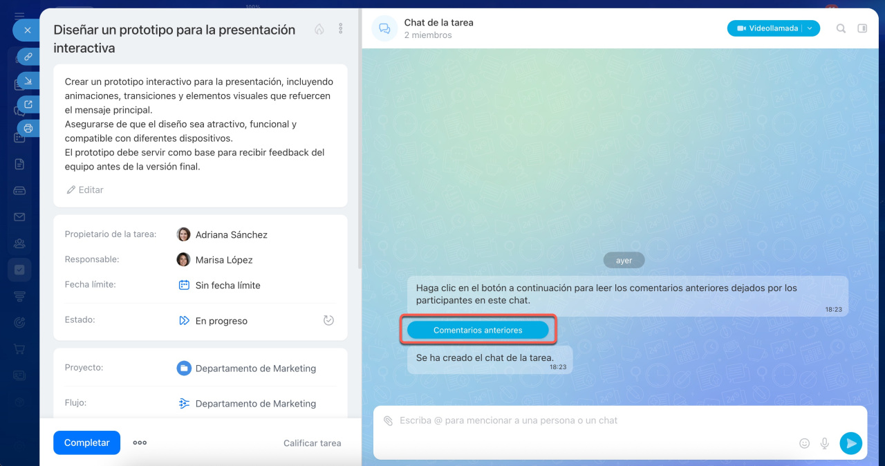 Los comentarios de la antigua ficha de tareas están disponibles en el chat en modo de solo lectura.