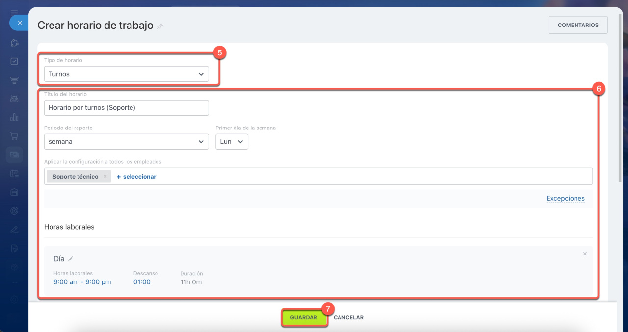 - Establece horas laborales, días de trabajo y descansos según las necesidades de tu empresa.