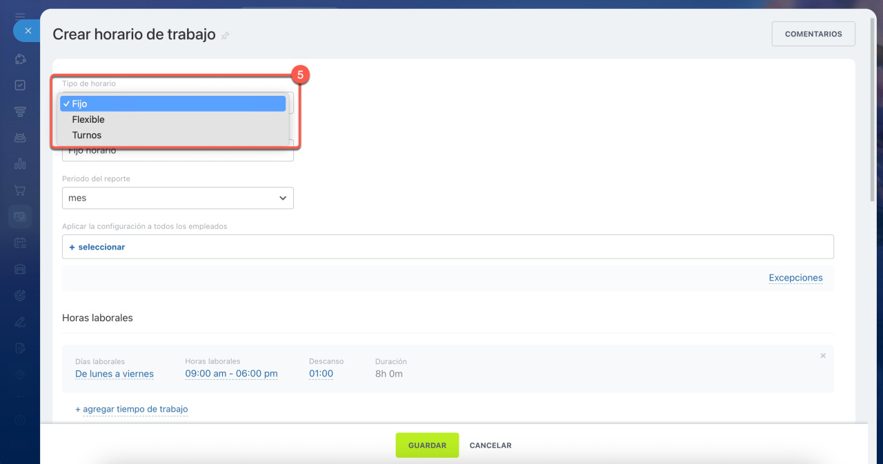 Accede a Empleados > Tiempo y reportes > Horarios de trabajo > Agregar un horario y selecciona el tipo de horario que necesites.