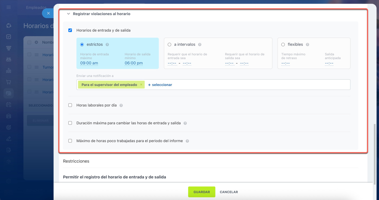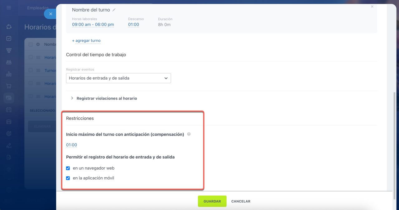 - Inicio del turno: especifica la hora máxima permitida para que un empleado comience su turno.