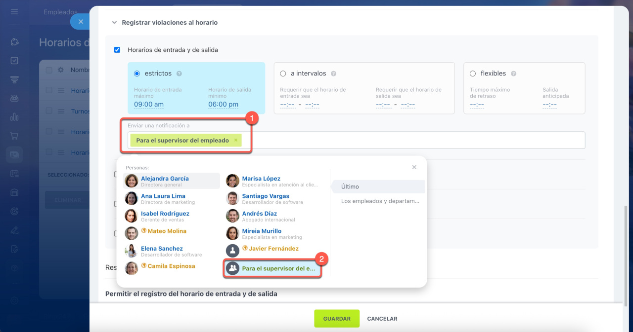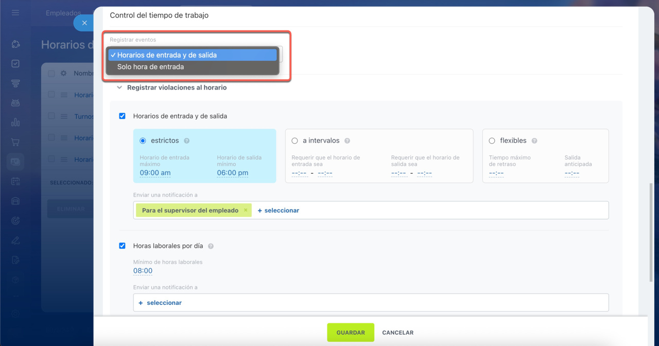 - Horarios de entrada y salida: define franjas horarias obligatorias. Si un empleado las incumple, se enviarán notificaciones.