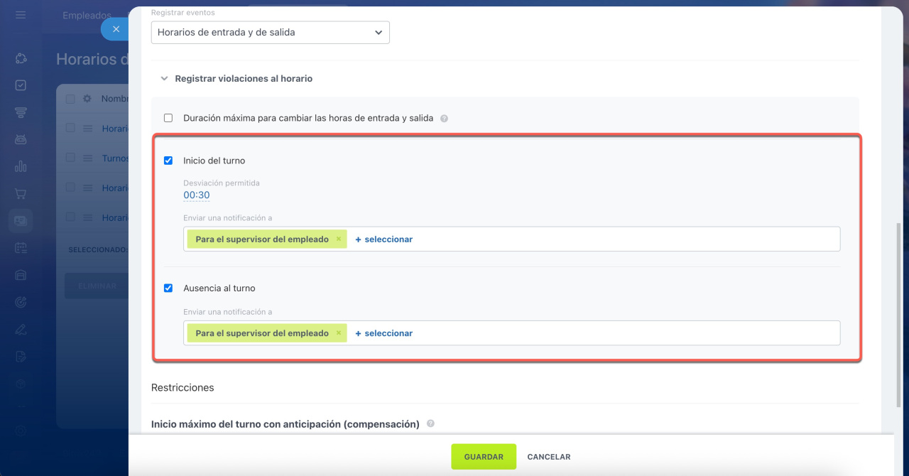 El horario por turnos incluye opciones adicionales para el control de incumplimientos: