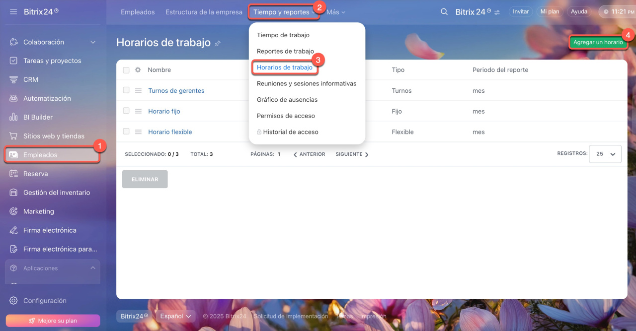 - Crea horarios de trabajo y controla las horas laborales de los empleados en Bitrix24.
