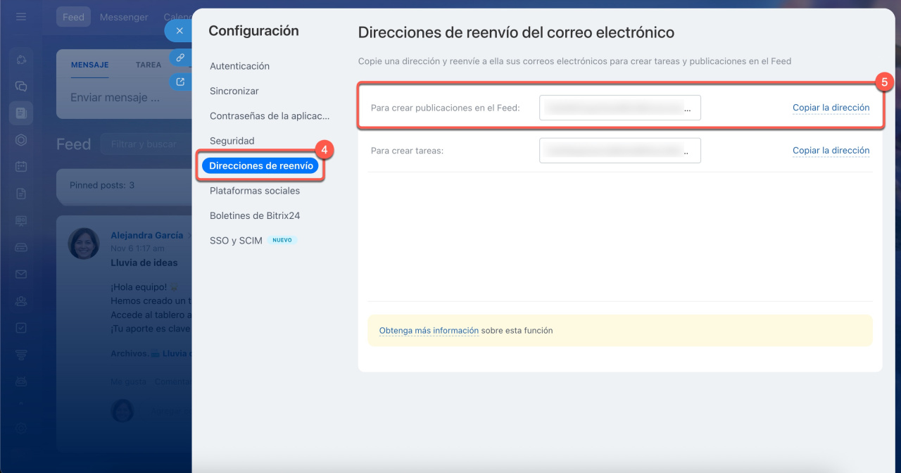 - Copia la dirección del campo Para crear publicaciones en el Feed y compártela con el usuario externo.