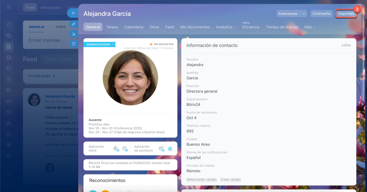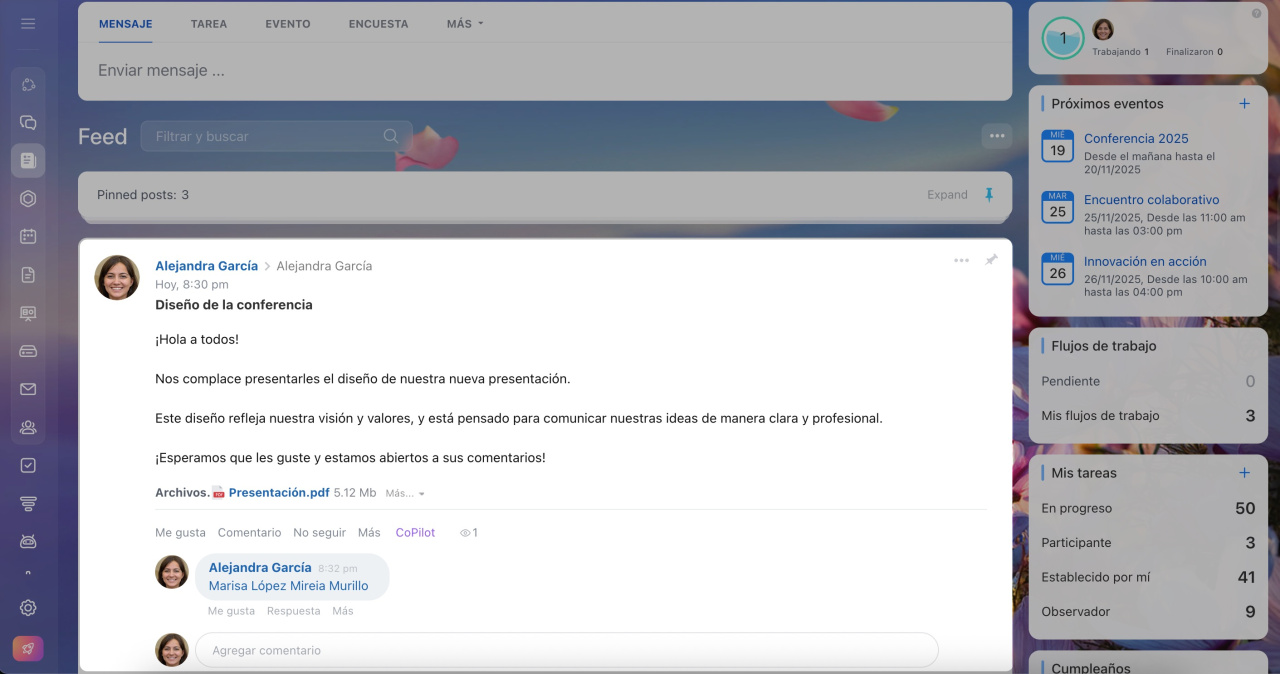 Una vez enviado el correo, la publicación aparecerá en Bitrix24. Estará dirigida al empleado desde cuyo perfil se copió el enlace, quien podrá mencionar a otros compañeros para discutir la publicación en conjunto.
