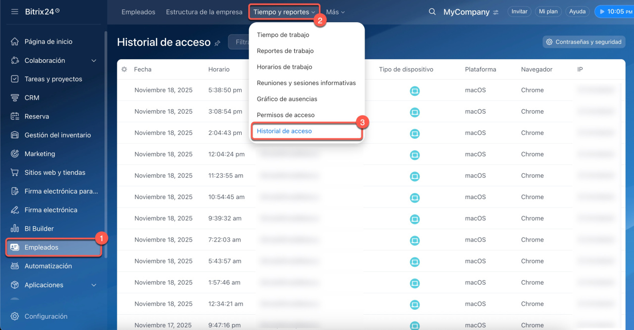 El historial de inicio de sesión está disponible en la sección Empleados > Tiempo y reportes > Historial de acceso. Los administradores pueden ver los inicios de sesión de todos los empleados, mientras que los empleados solo pueden ver los suyos propios.