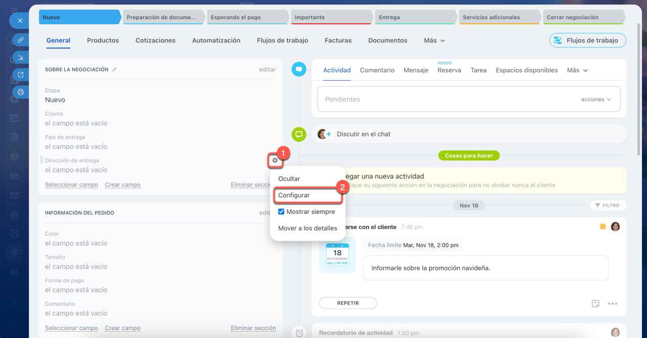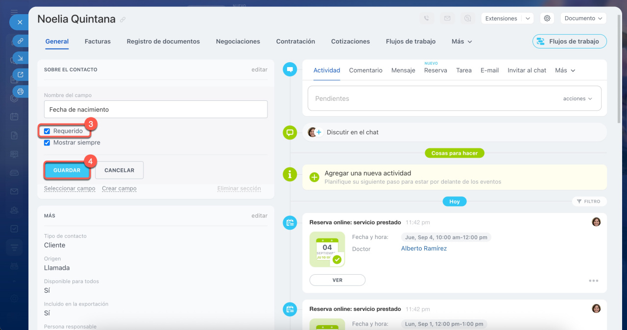 - En negociaciones, los campos requeridos pueden variar según la etapa o el pipeline.