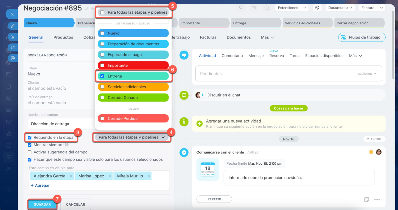 Para otros elementos del CRM, puedes configurar campos requeridos a partir de una etapa específica. En las negociaciones, también es posible configurarlos para diferentes pipelines. Por ejemplo, podrías hacer obligatorio el campo "Dirección de entrega" cuando la negociación pase a la etapa correspondiente.
