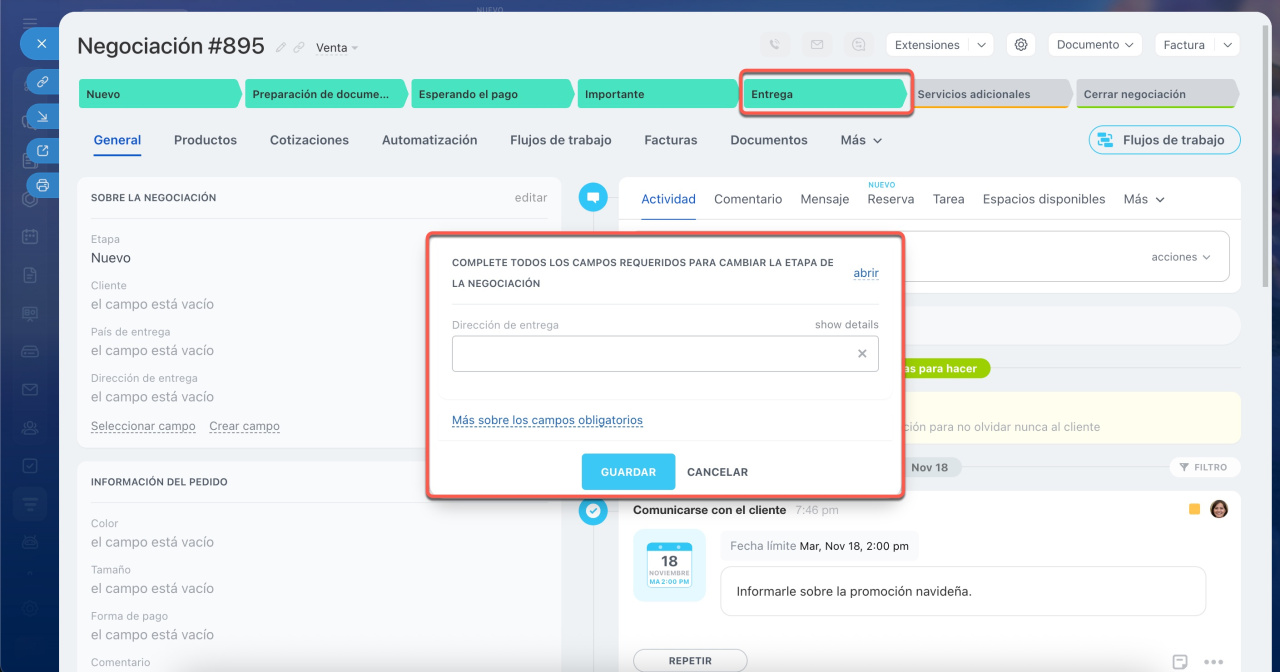 Al intentar mover la negociación a la etapa "Entrega", Bitrix24 solicitará completar la dirección de entrega