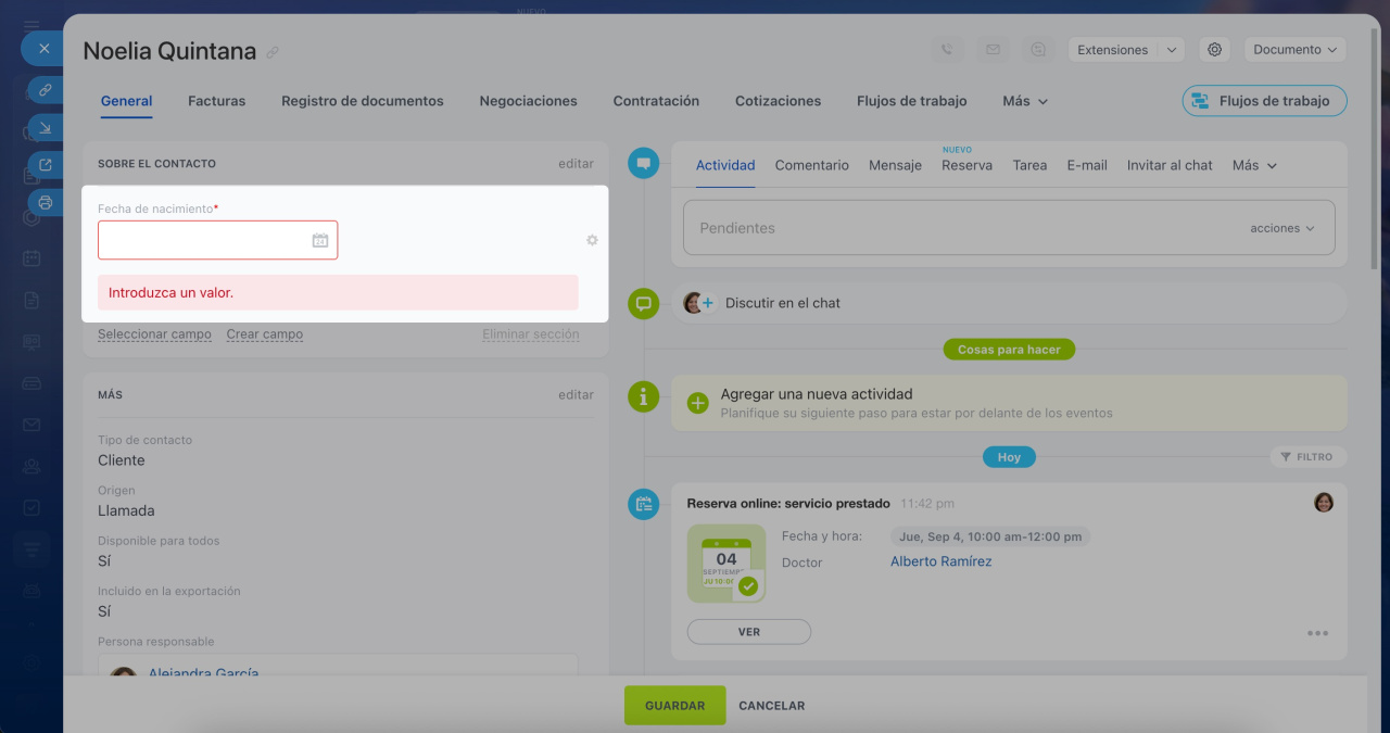 A veces no es posible completar todos los campos de una ficha del CRM inmediatamente porque falta información. Puedes configurar campos específicos como obligatorios en las fichas del CRM. Estos campos se marcan con un asterisco rojo, y el sistema no permitirá guardar los cambios hasta que se completen.