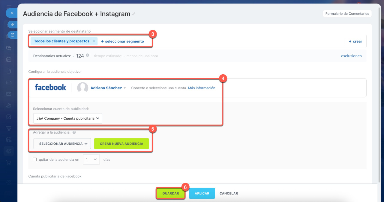 - Ve a la sección Marketing > Audiencia de Facebook + Instagram o Google Ads. Selecciona un segmento, sincroniza tu cuenta y crea una nueva audiencia publicitaria.