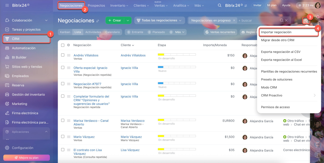 1-2. Accede a CRM > Negociaciones o cualquier otra entidad del CRM.