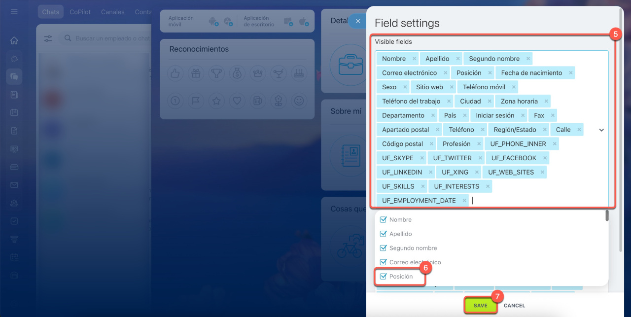 5-7. Despliega la lista de campos disponibles y activa la casilla del campo deseado. Guarda los cambios.