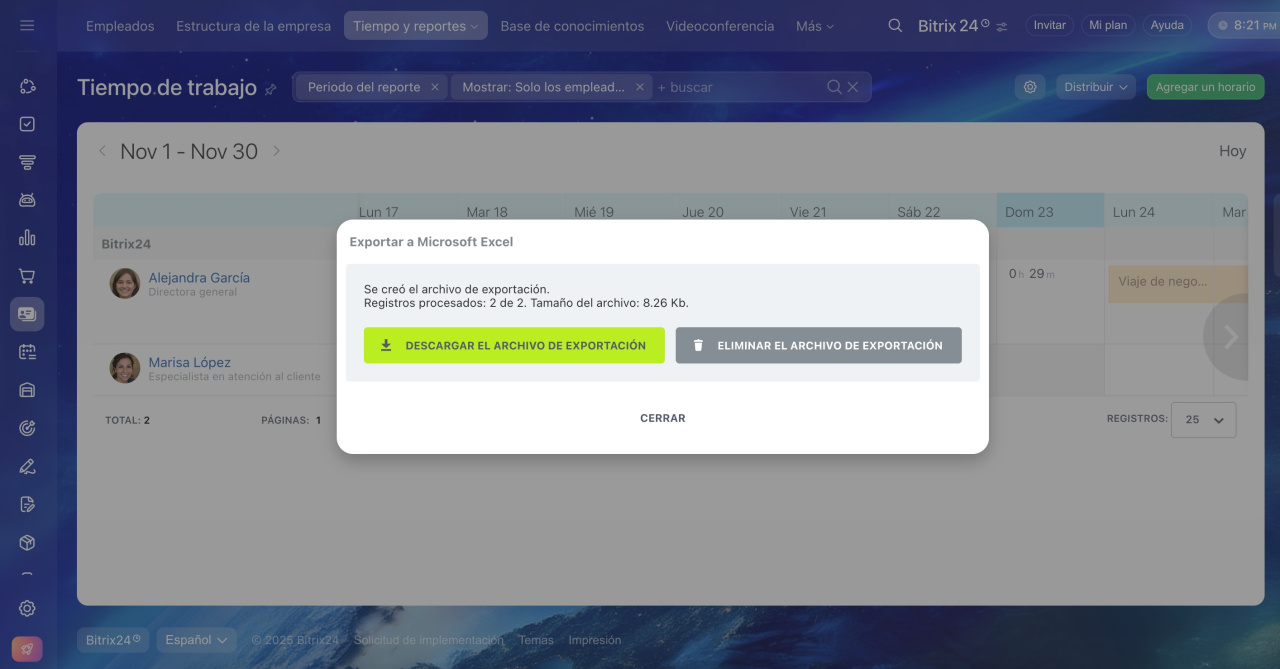 Exportar a Microsoft Excel. Exporta la tabla con el tiempo de trabajo de los empleados para el período seleccionado.