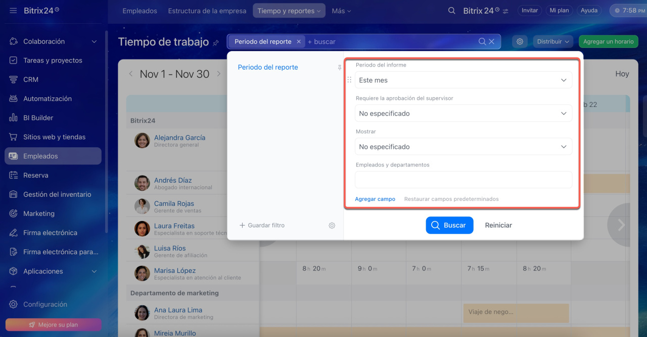 Los empleados pueden usar filtros para definir el período del reporte y ver su tiempo laboral en fechas específicas.