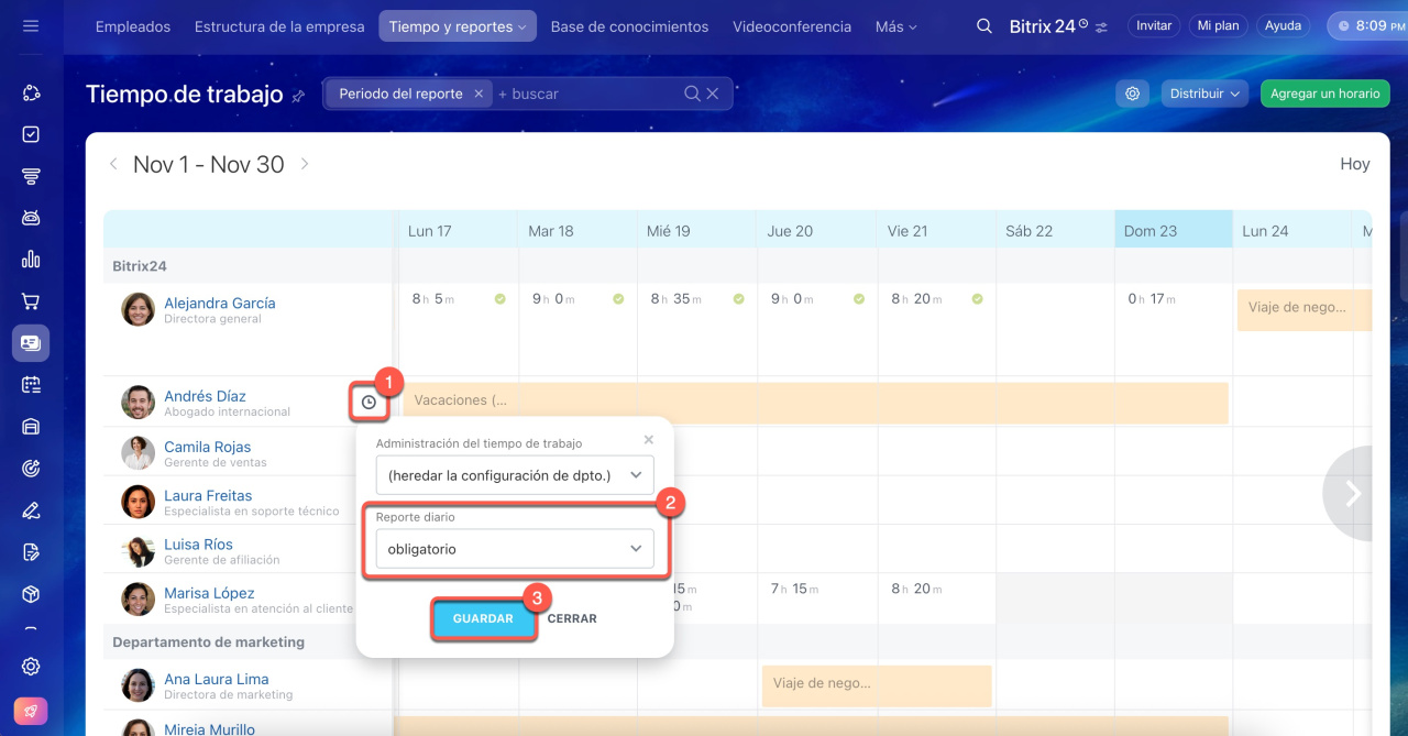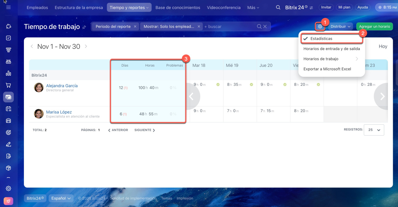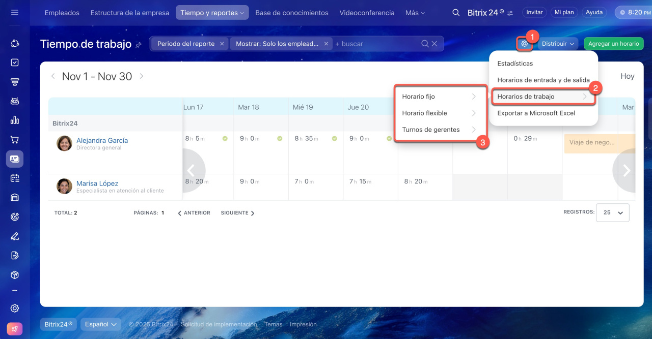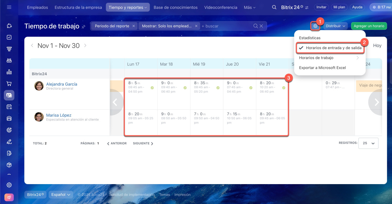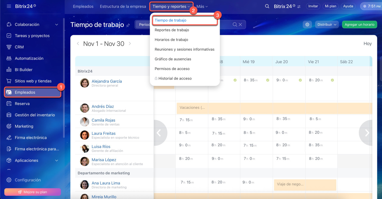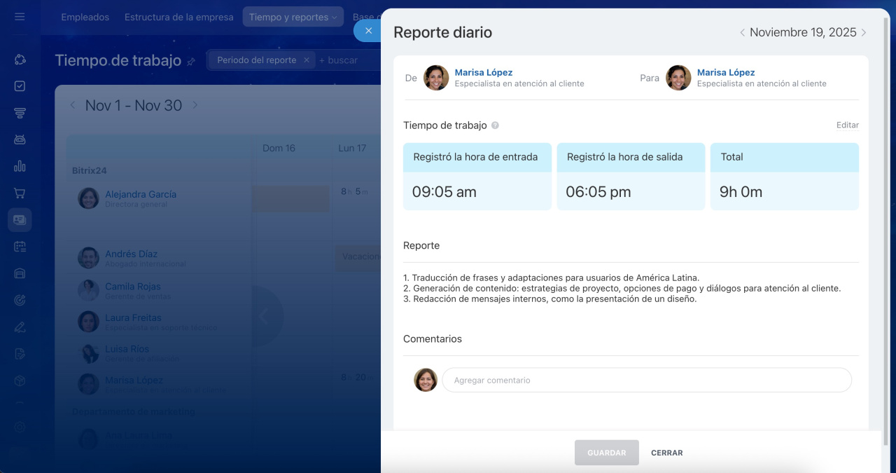 - Con Bitrix24, puedes realizar un seguimiento eficiente de las horas laborales y reportes diarios. Ve a Empleados > Tiempo y reportes > Tiempo de trabajo.