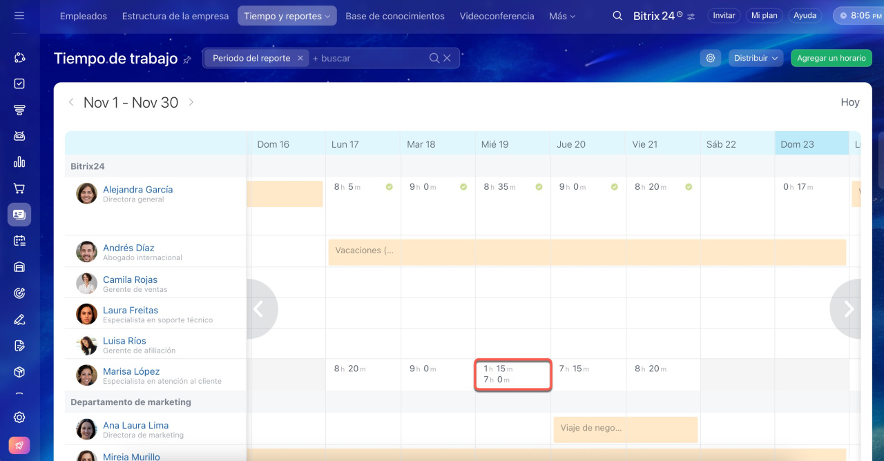 Ve a la sección Empleados > Tiempo y reportes > Tiempo de trabajo. Los datos que verán los empleados en esta página varían según su posición en la estructura de la compañía: