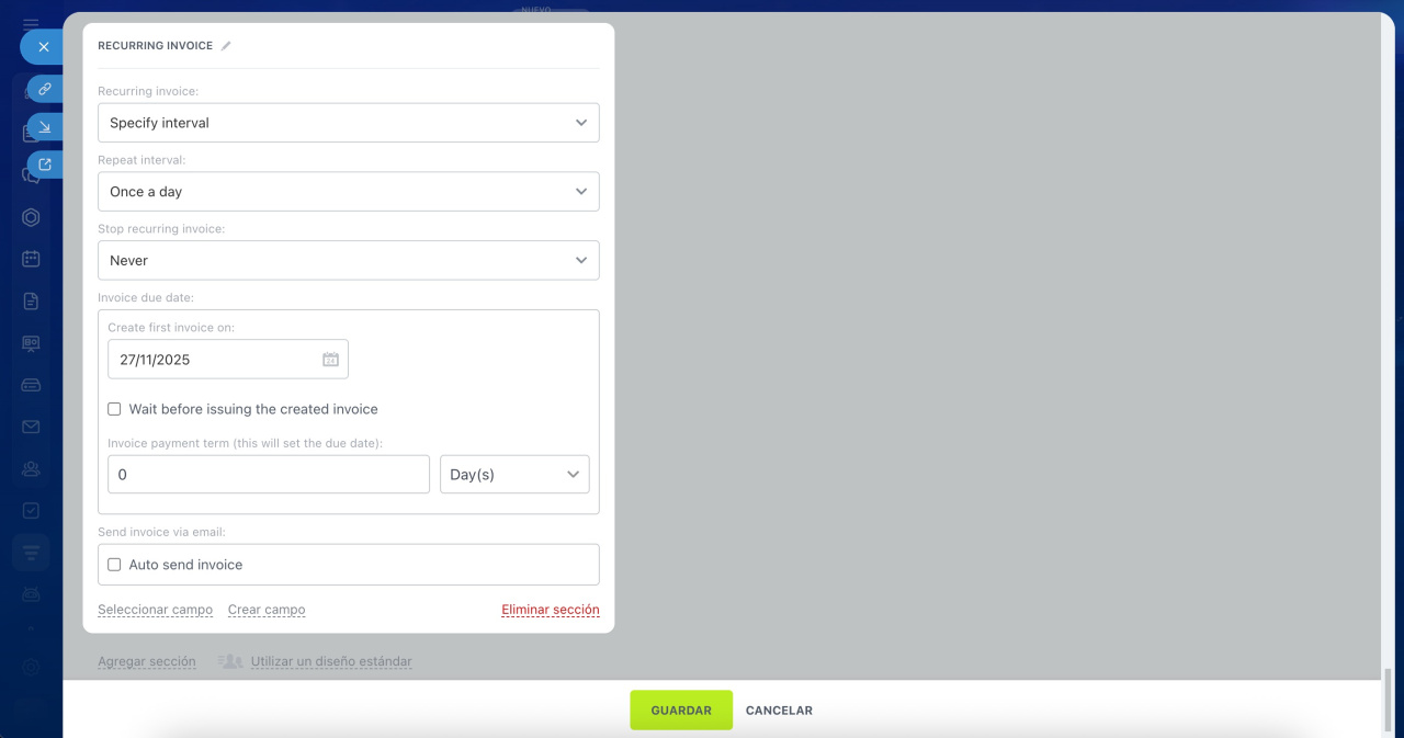 Facturas recurrentes. Te permiten gestionar los pagos periódicos de tus clientes, como alquileres, servicios o suscripciones. El CRM genera y envía estas facturas automáticamente según la programación que configures. Esto garantiza que los clientes reciban recordatorios de pago puntuales y te ayuda a ahorrar tiempo en tareas repetitivas.