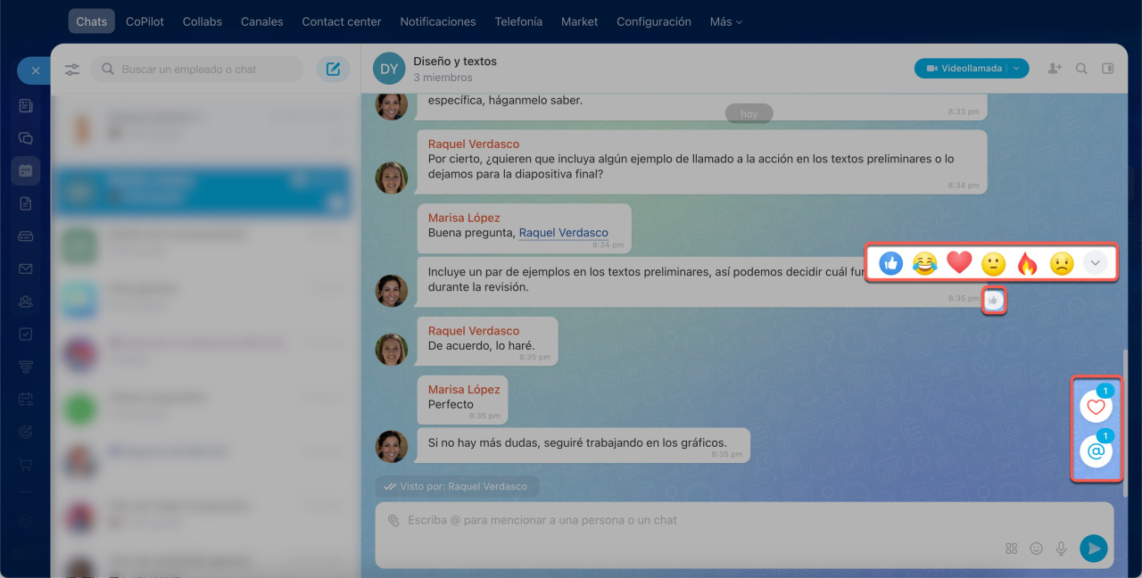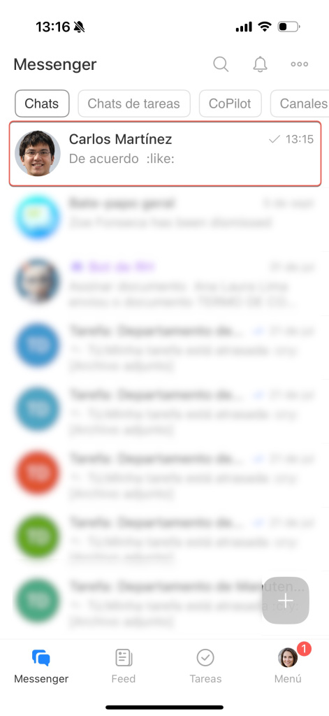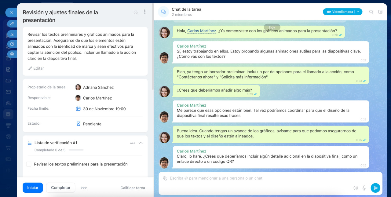 Además, la ficha de tareas ahora incluye un chat integrado que mantiene el contexto completo de las discusiones: puedes ver cambios recientes, realizar llamadas, aclarar detalles y tomar decisiones rápidamente sin salir de la tarea.