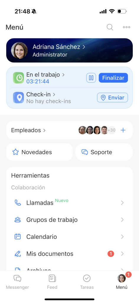 Hemos actualizado la aplicación móvil de Bitrix24. Ahora funciona más rápido y cuenta con una interfaz más intuitiva. Puedes personalizar el menú, las notificaciones y el tema para adaptarlo a tus necesidades.