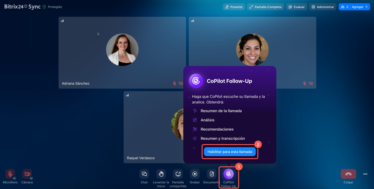 CoPilot Follow-Up para videollamadas. La inteligencia artificial analiza las videollamadas: las transcribe, registra acuerdos y evalúa la participación de los asistentes. Esto ayuda a retener decisiones importantes tras las reuniones y mejora la eficiencia del equipo.
