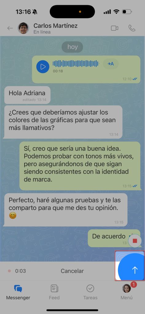 - Tareas de audio y video con IA: las tareas se crean a partir de mensajes de voz y notas de video. La IA reconoce el texto, identifica al responsable, establece plazos y genera listas de verificación automáticamente.