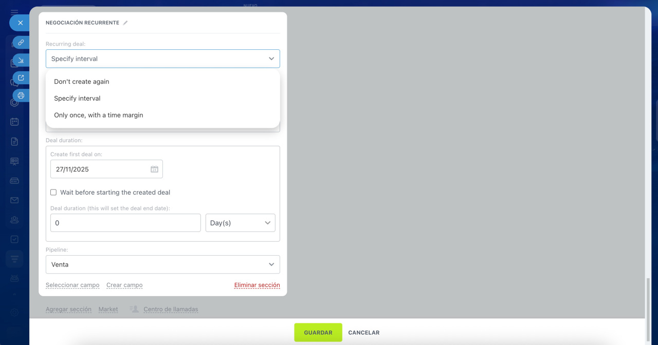 Negociaciones recurrentes. Son útiles para trabajar con clientes habituales, como en casos de mantenimiento mensual, alquileres o suministros. El CRM crea estas negociaciones automáticamente según la programación que configures. Esto te ayuda a contactar a los clientes a tiempo y reduce tareas rutinarias.
