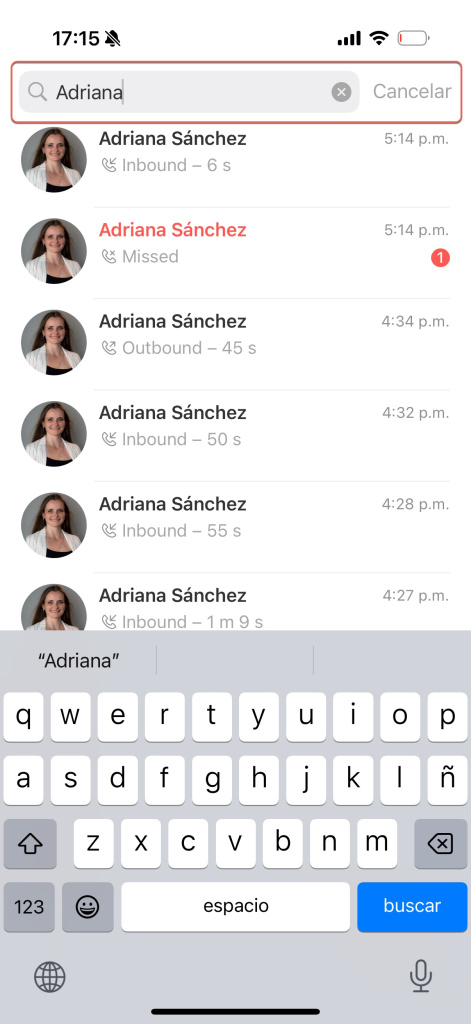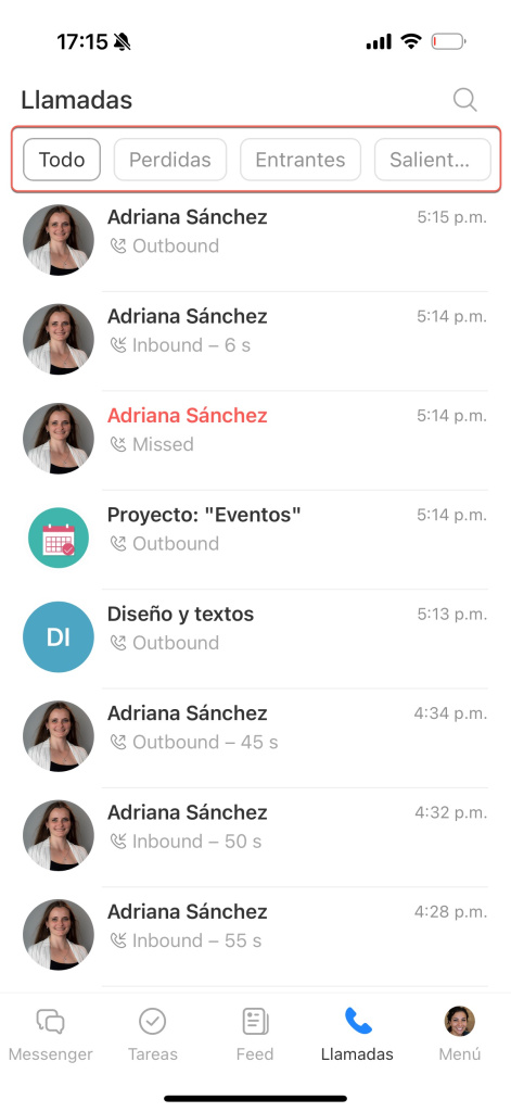 Lista de llamadas en la aplicación móvil. Las llamadas entrantes, salientes y perdidas ahora están disponibles en una sola sección. Puedes devolver la llamada a un colega directamente desde la aplicación.