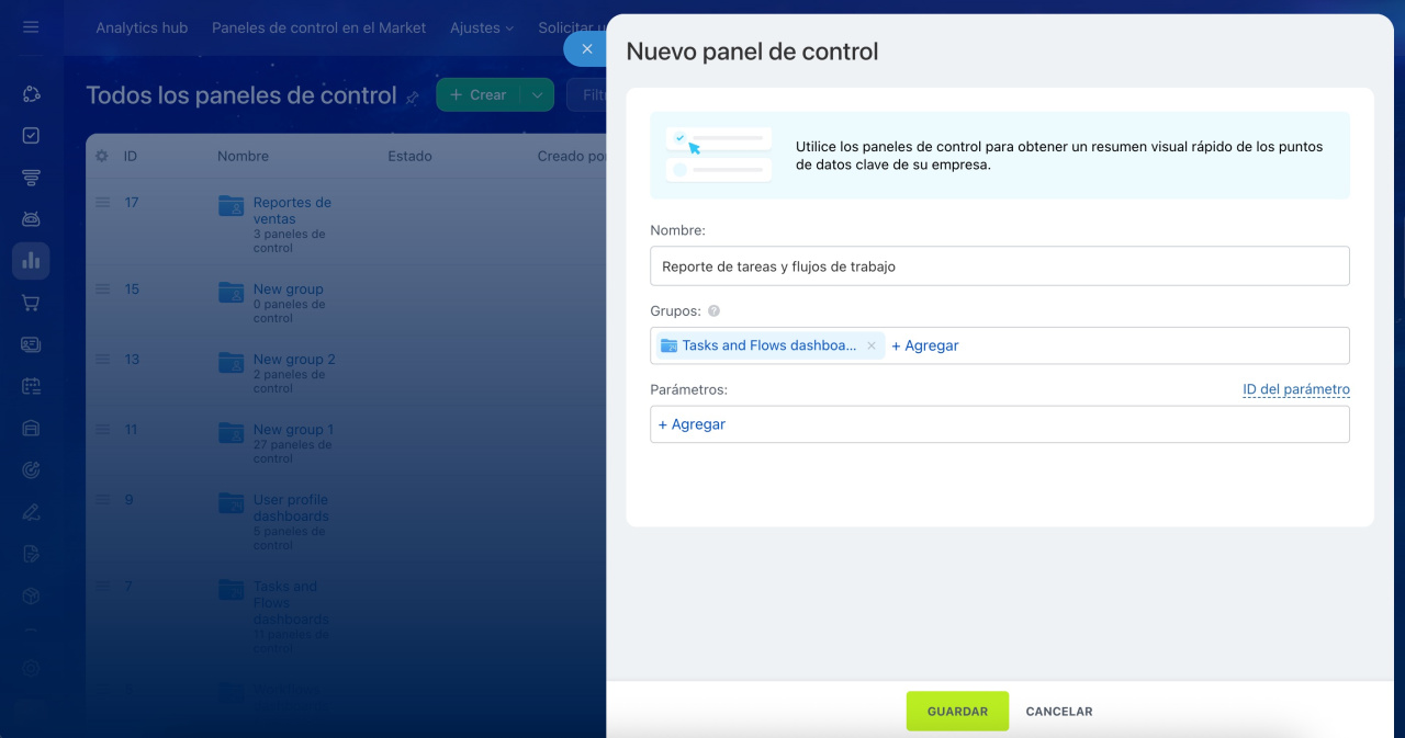 - Filtros por parámetros y estructura de la compañía: ayudan a visualizar datos específicos de empleados, flujos de tareas o plantillas de procesos de negocio.
