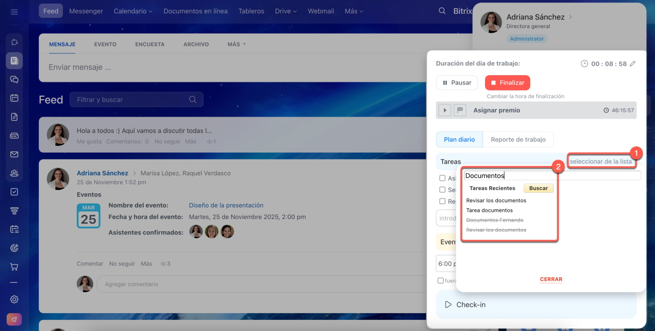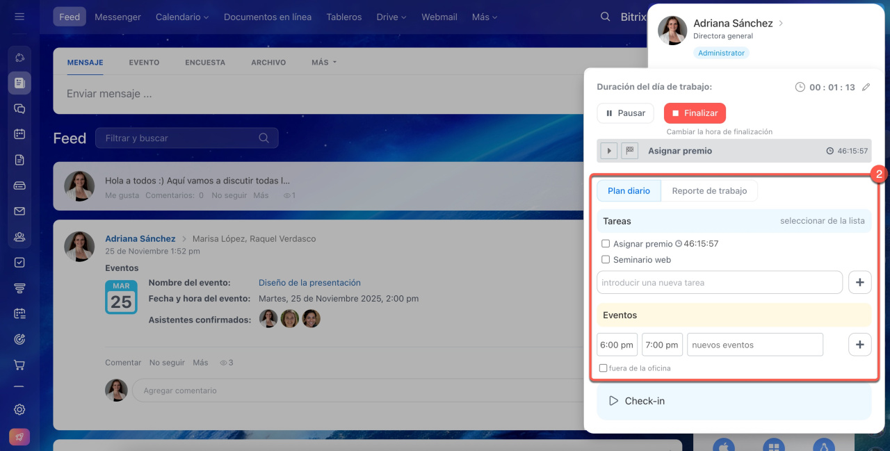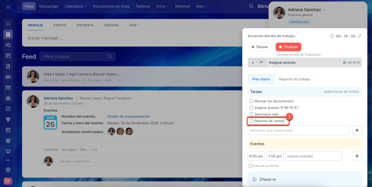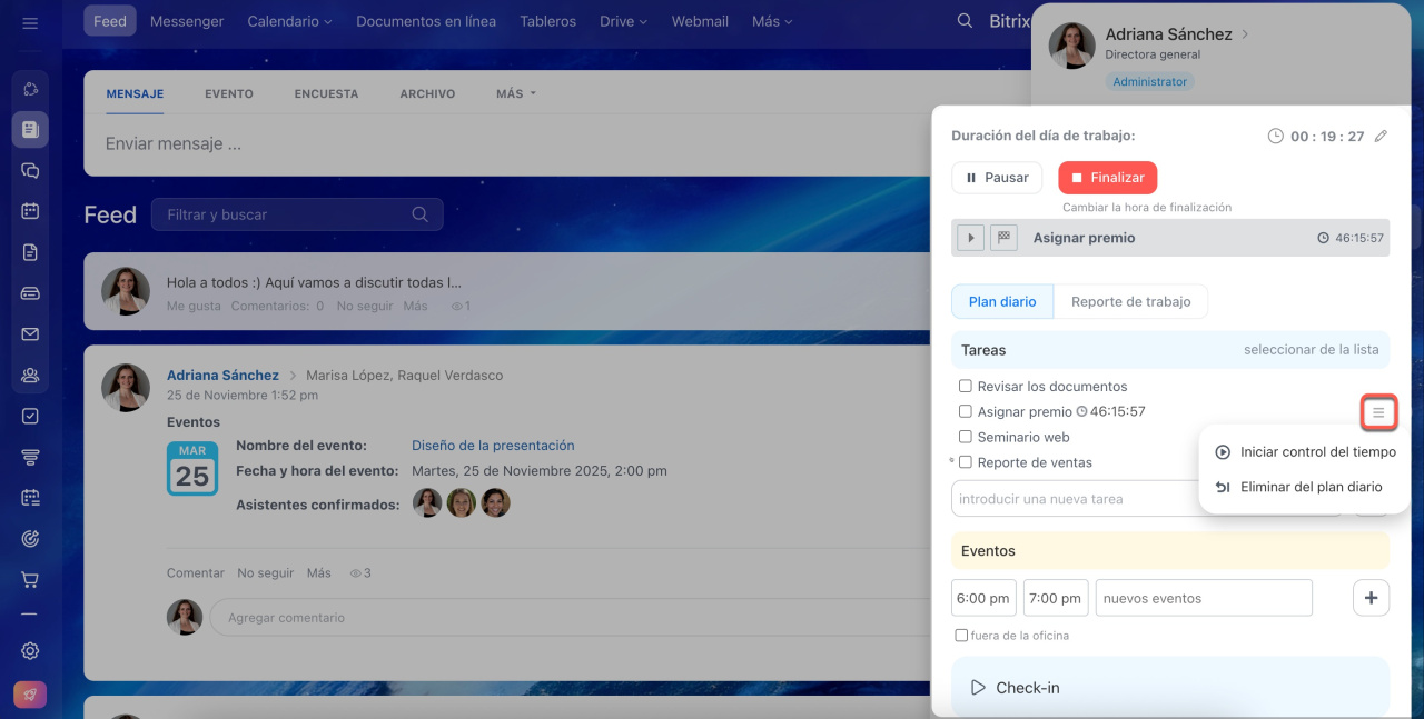 Organiza tu jornada laboral con Bitrix24: programa reuniones, crea tareas, inicia el seguimiento de tiempo y resuelve los asuntos pendientes de manera eficiente.