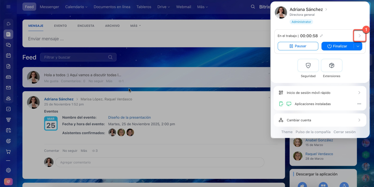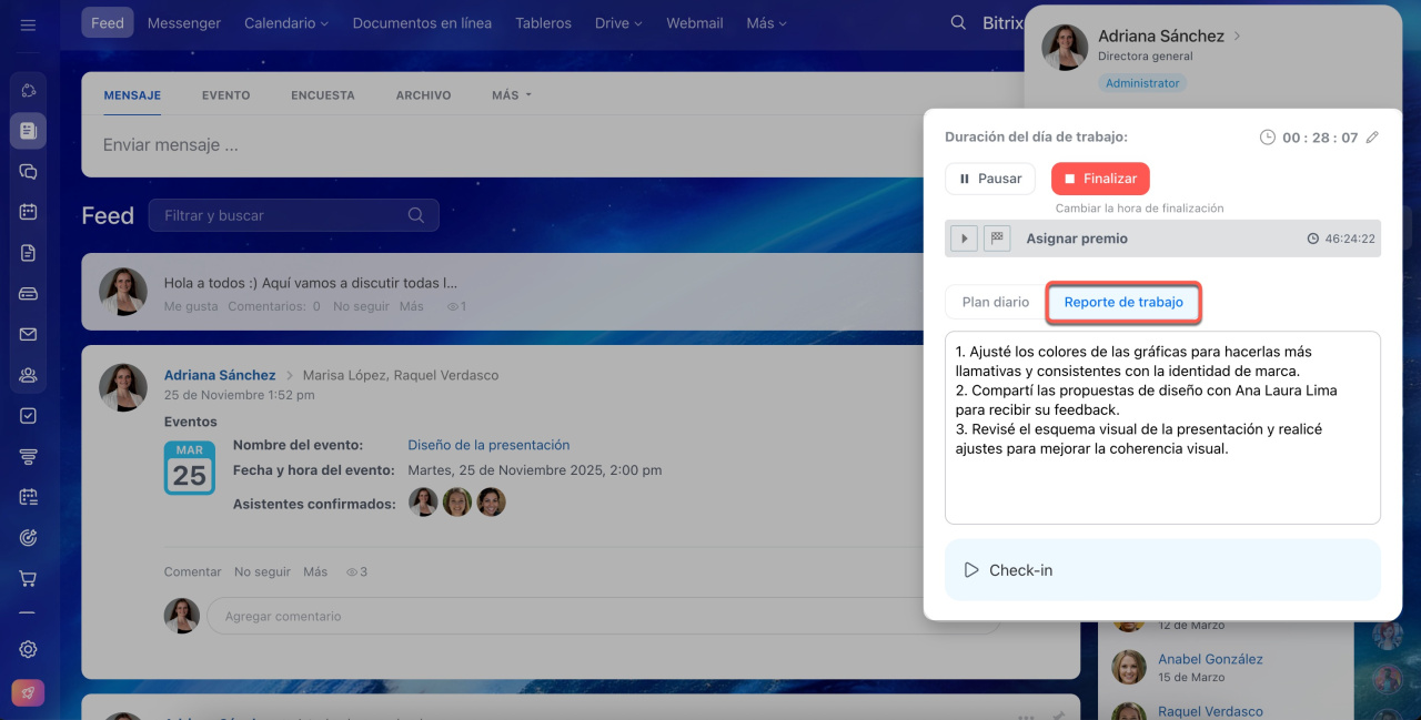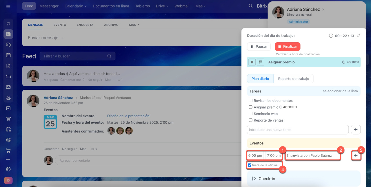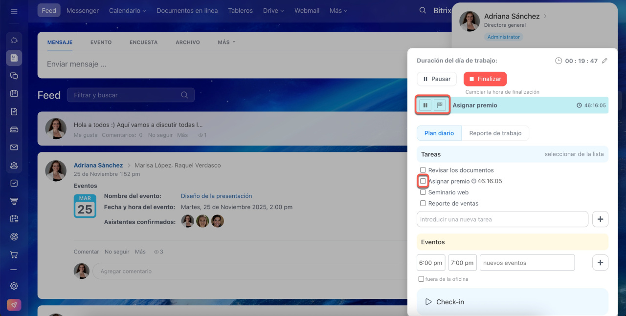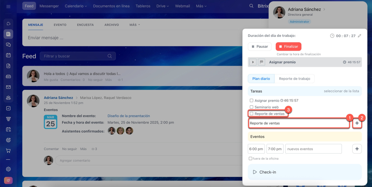 Organiza tu jornada laboral con Bitrix24: programa reuniones, crea tareas, inicia el seguimiento de tiempo y resuelve los asuntos pendientes de manera eficiente.