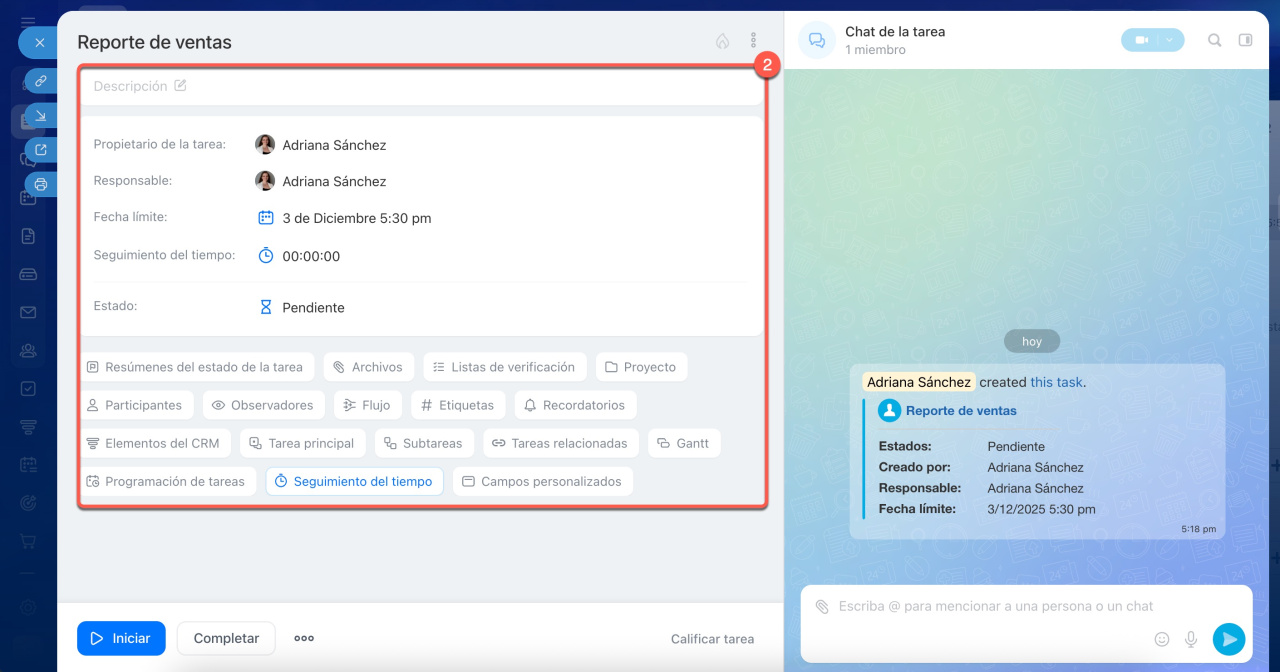 Se iniciará un temporizador que registrará el tiempo dedicado a la tarea. Puedes pausarlo o finalizarla en cualquier momento. Para marcarla como completada, haz clic en el icono de la bandera o márcala como finalizada.