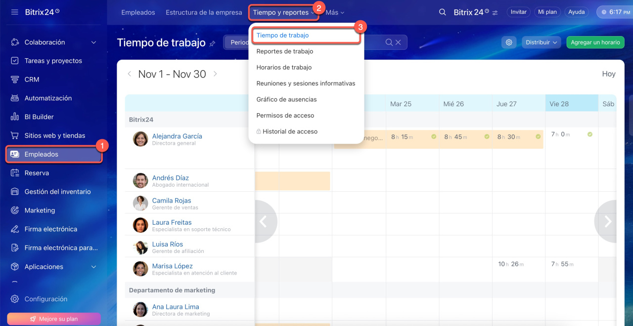 1-3. Ve a la sección Empleados > Tiempo y reportes > Tiempo de trabajo.