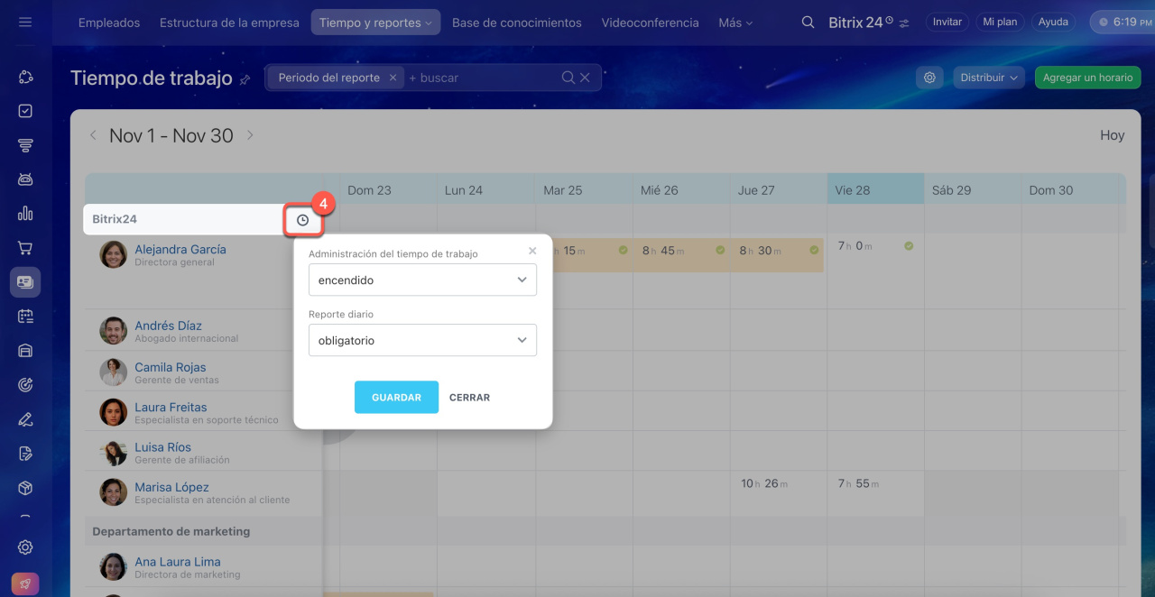 • Haz clic en el icono del reloj junto al nombre de un departamento para gestionar el tiempo de trabajo de sus empleados.