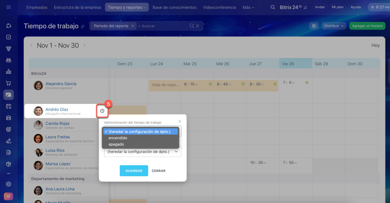 • Los administradores de Bitrix24 pueden desactivar el seguimiento del tiempo de trabajo para un empleado, un departamento o toda la empresa.