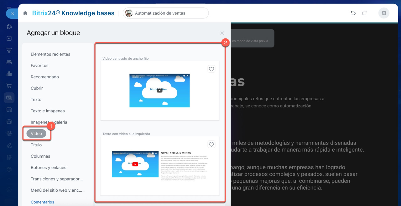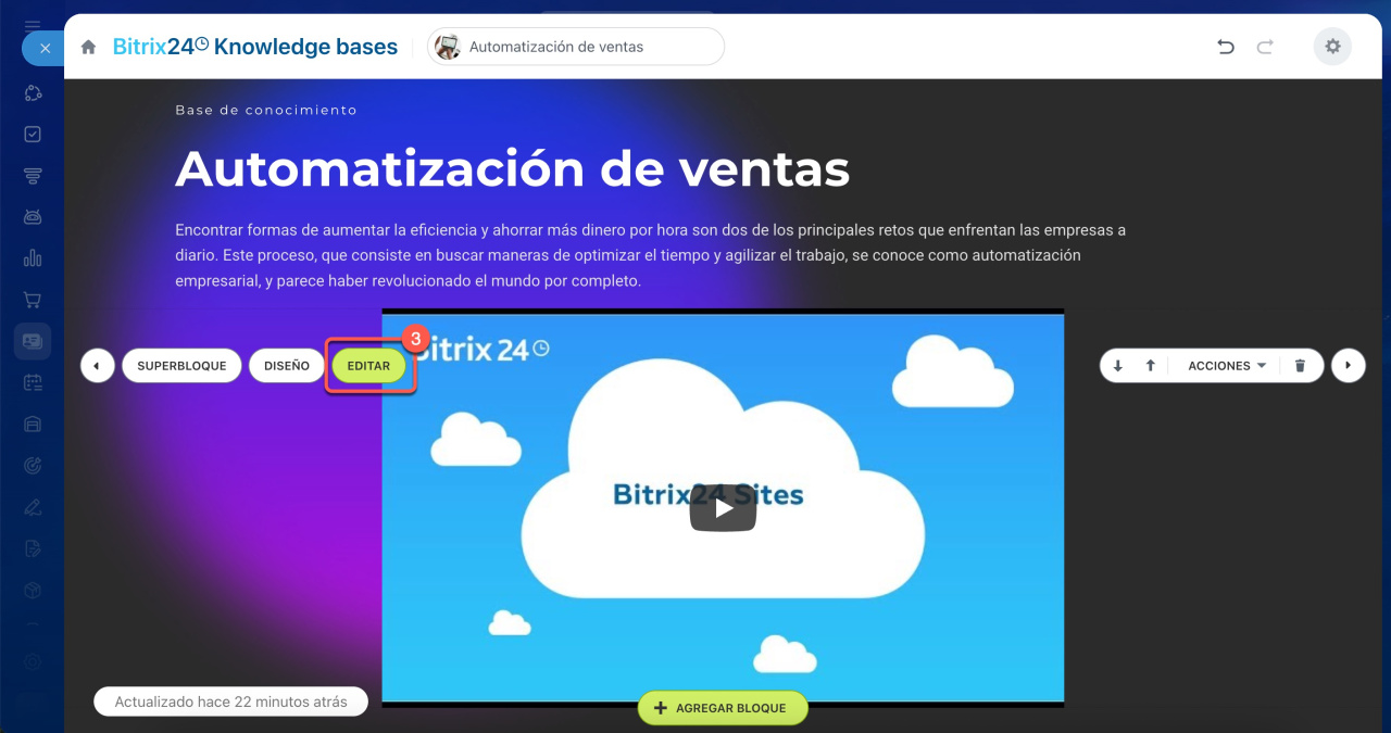 Puedes insertar videos desde YouTube o desde Bitrix24 Drive en tus bases de conocimientos. Los videos, como tutoriales o presentaciones de productos, hacen que la base de conocimientos sea más útil e informativa para los empleados.