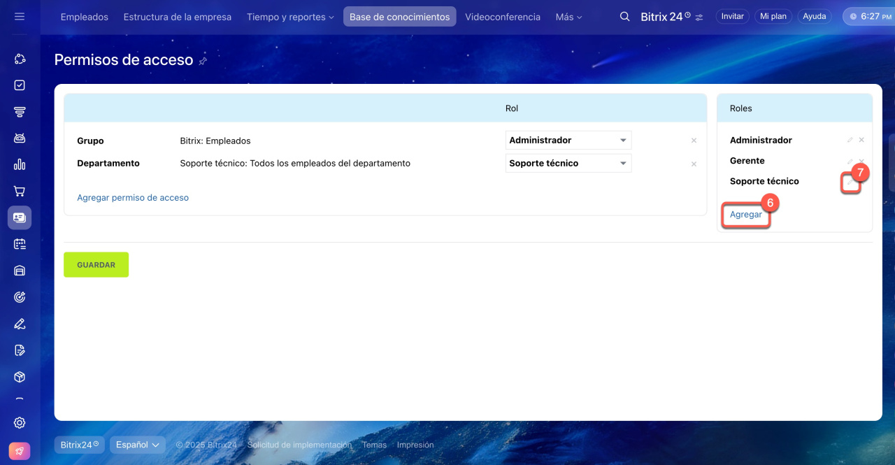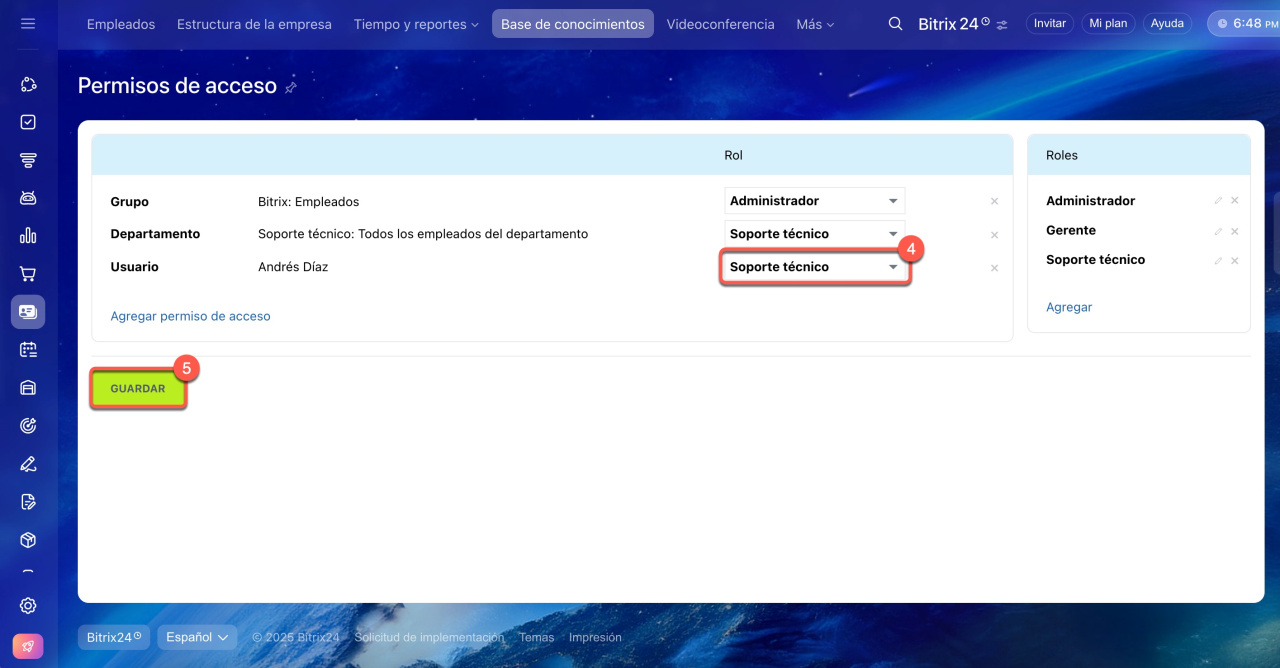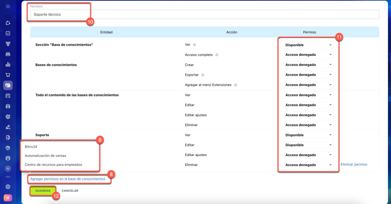 En Bitrix24 puedes crear roles con diferentes permisos de acceso a las bases de conocimientos y asignarlos a empleados, grupos o departamentos. Los usuarios solo verán las bases de conocimientos a las que tengan acceso según su configuración de permisos. Si un rol no incluye acceso a una base específica, el empleado no podrá verla.