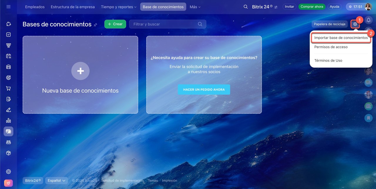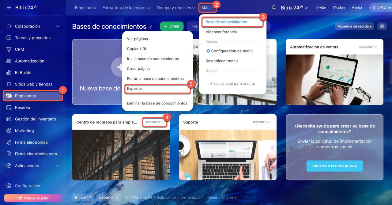 En Bitrix24, puedes crear una base de conocimientos desde una plantilla en blanco o utilizando una solución prediseñada. Sin embargo, no es posible guardar una base de conocimientos como plantilla. Si necesitas reutilizar una misma estructura con frecuencia, puedes usar las funciones de exportación e importación para evitar crearla desde cero cada vez.