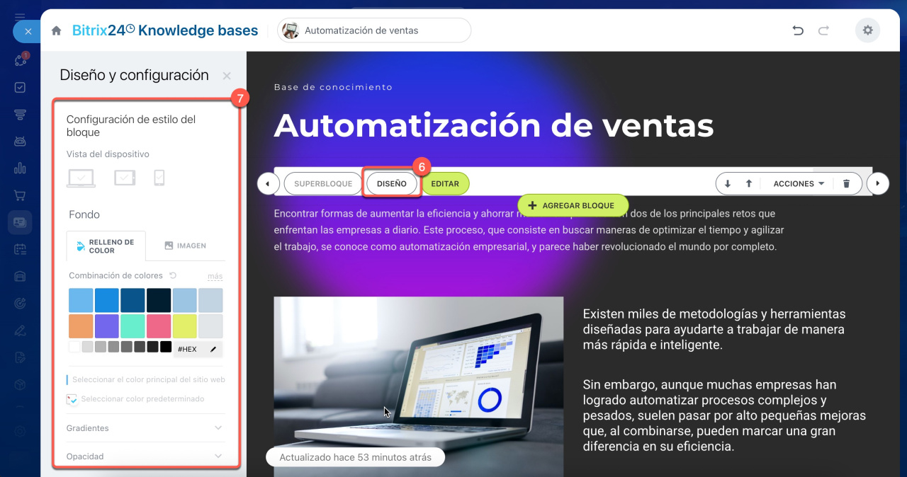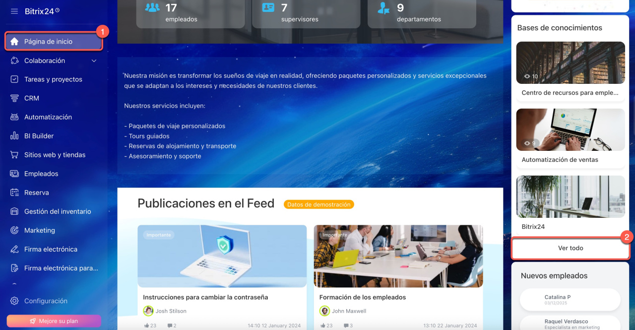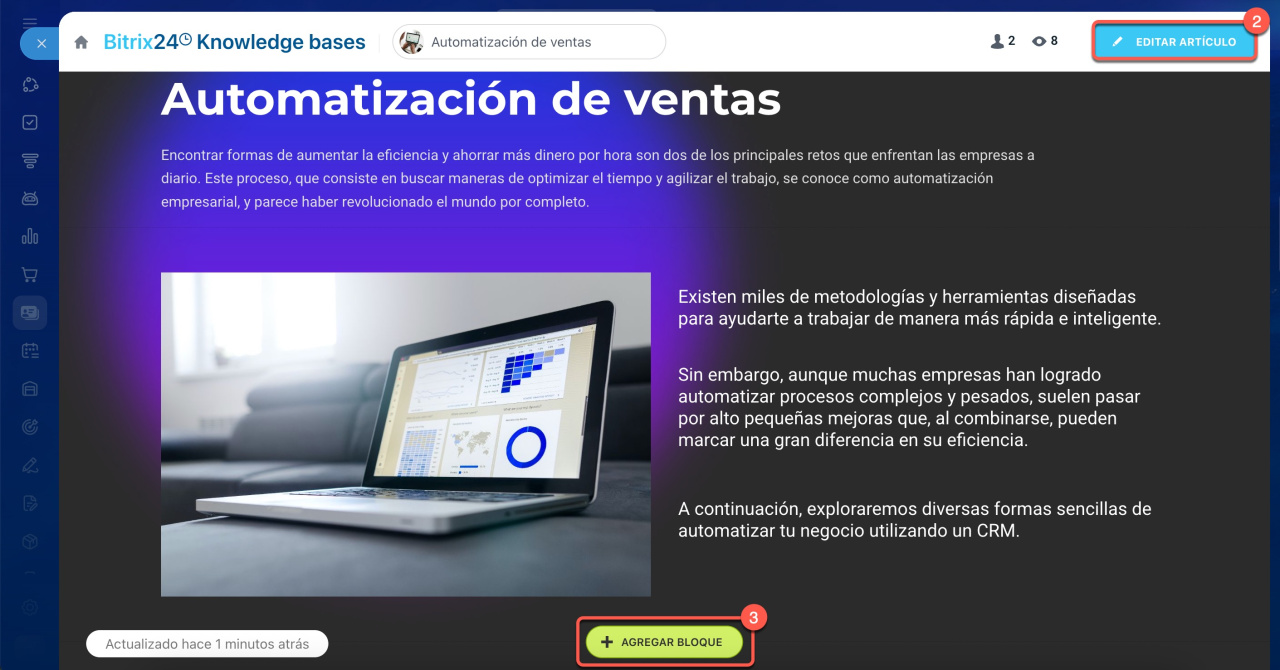 En Bitrix24 puedes crear una base de conocimientos, es decir, un manual en línea con navegación intuitiva y búsqueda integrada. Es ideal para almacenar instrucciones, reglamentos y otros materiales útiles. Facilita la adaptación de los nuevos empleados y ayuda al equipo a trabajar con unas reglas unificadas. En este artículo encontrarás respuestas a las preguntas más frecuentes sobre las bases de conocimientos en Bitrix24.